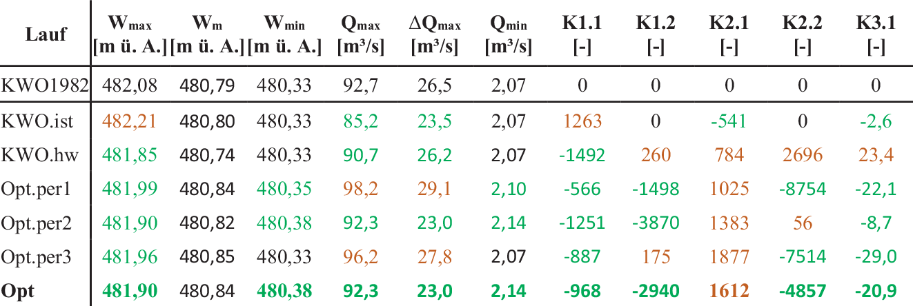 Ergebnistabelle mit Auflistung der erzielten Werte bei den Kriterien 1 bis 11 sowie des mittleren Wasserstands (Wm). Grün gefärbte Werte entsprechen einer Verbesserung zur Referenz (Modellierung mit KWO1982), braun gefärbte einer Verschlechterung sowie schwarze Werte keiner Veränderung. Beim Lauf „Opt.per1“ wurde beispielsweise die für Periode 1 optimierte KWO über das gesamte Jahr angesetzt. Beim Lauf „Opt“ kam je nach Periode die zugehörige saisonal optimierte KWO zur Anwendung