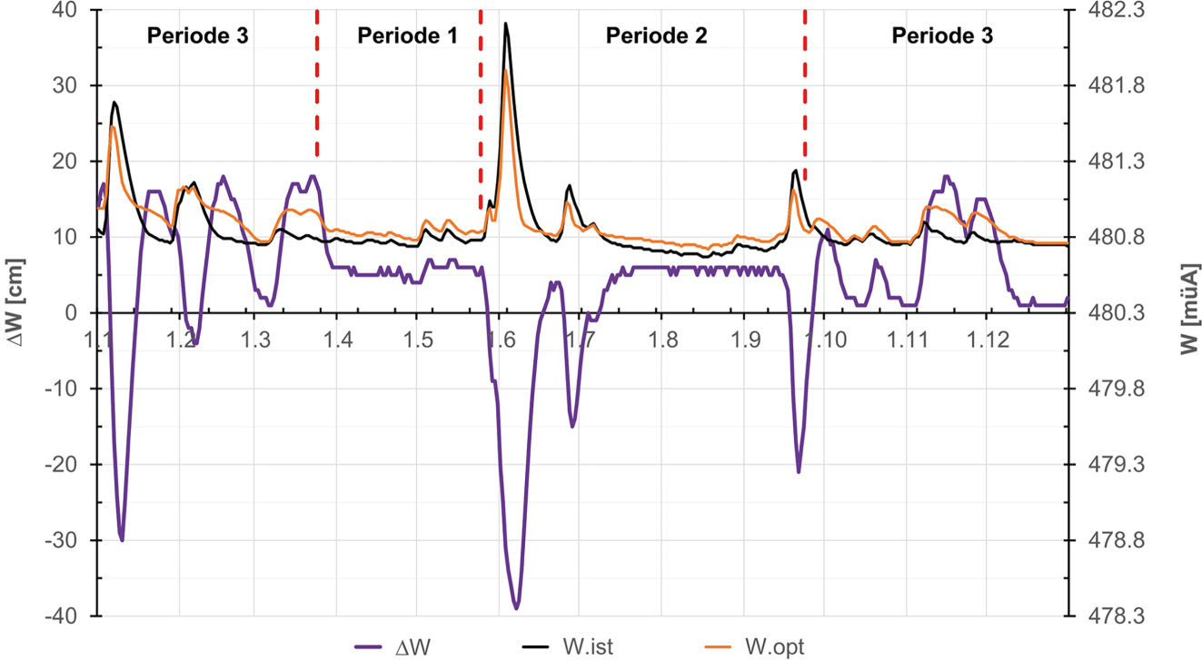 Verlauf des Wasserstands des Mondsees im Jahr 2013. Dargestellt sind die Ergebnisse der Modellierungen mit KWO.ist (W.ist), KWO.opt (W.opt) sowie die Differenz davon (∆W = W.opt‑W.ist). Für ∆W gilt die Beschriftung der linken vertikalen Achse, für W.ist sowie W.opt jene der rechten Achse