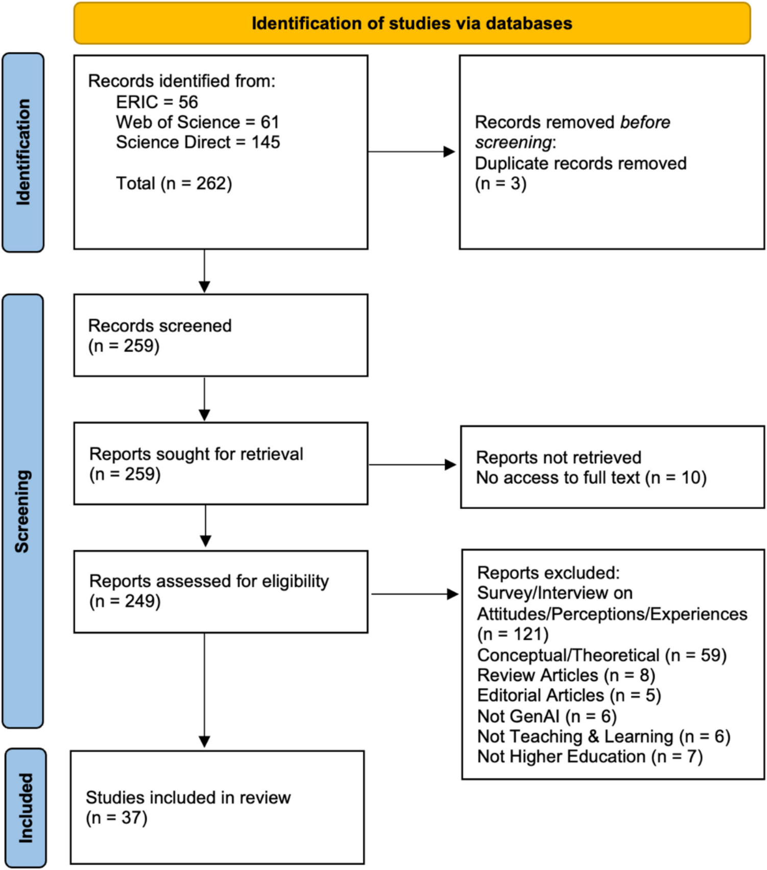 A total of 262 articles were initially identified from ERIC, Web of Science, and ScienceDirect. After screening the articles for relevance, a significant portion (n = 121, 46%) was excluded because these studies relied primarily on surveys and interviews to explore student and faculty perceptions of GenAI, rather than its direct application in teaching and learning. Additionally, review articles and editorials were excluded, as these do not provide original research data. Articles that did not explicitly focus on the use of GenAI in higher education teaching and learning were also excluded. After removing duplicates, 37 studies remained for inclusion in this review. Figure 1 presents a flowchart illustrating the article identification and screening process.