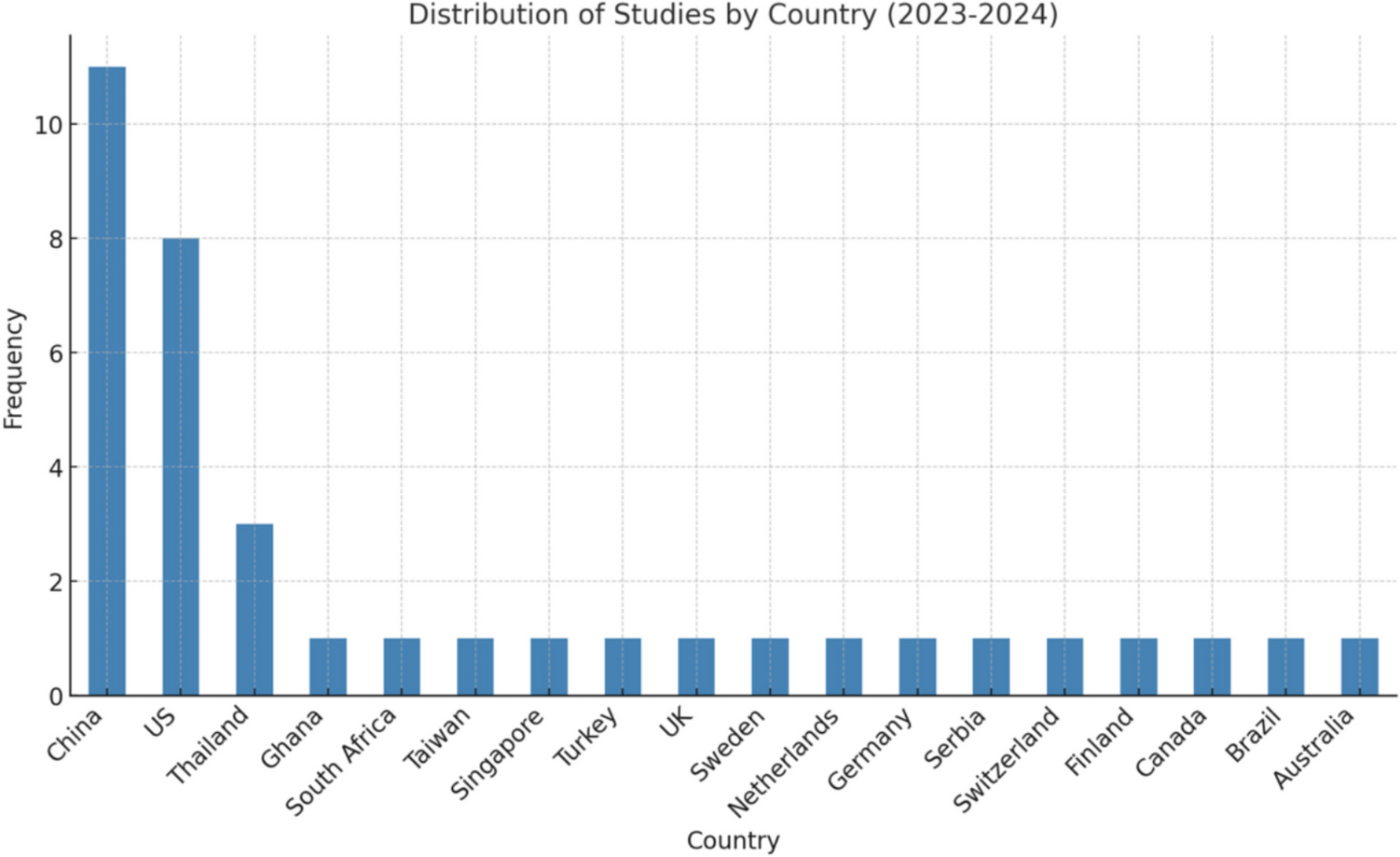 Research on GenAI in education is predominantly concentrated in China (including Hong Kong, which is administered as a Special Administrative Region with a high degree of autonomy), with a combined total of 11 publications highlighting a strong regional focus on GenAI-enhanced learning. The U.S. follows with eight publications. Beyond these regions, contributions span multiple continents, including Europe (Finland, Germany, Netherlands, Serbia, Sweden, UK), Asia (Singapore, Taiwan, Thailand, Turkey), Africa (South Africa, Ghana), North America (Canada), South America (Brazil), and Oceania (Australia).