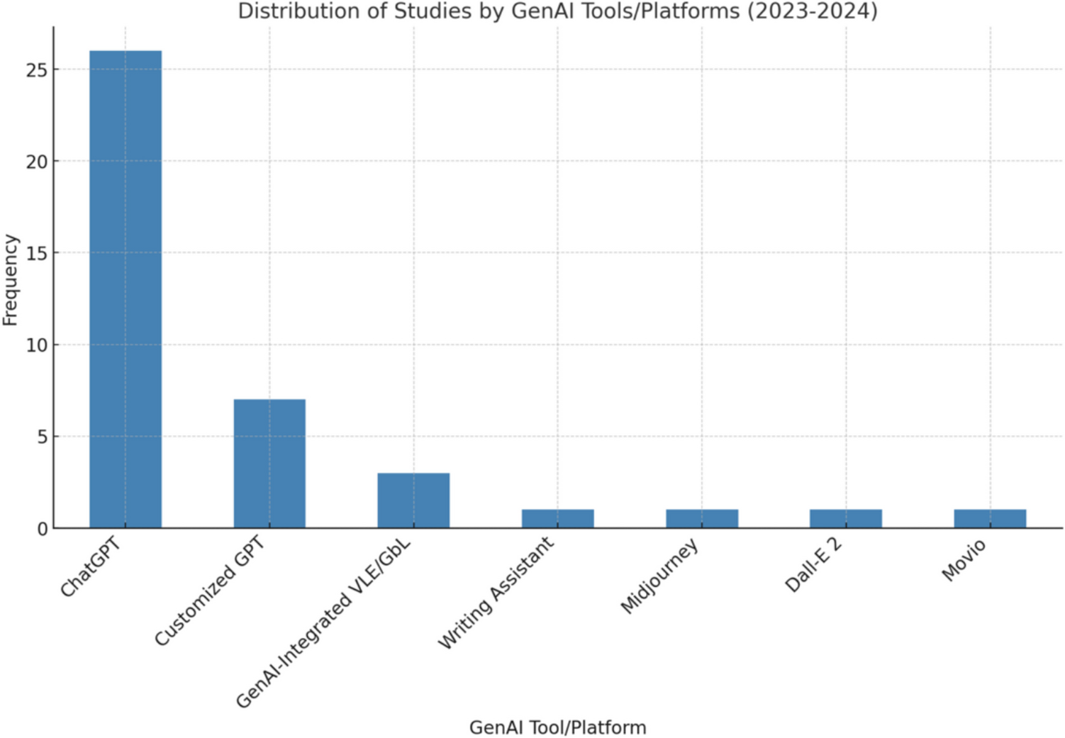 Figure 3 illustrates the distribution of GenAI tools, highlighting ChatGPT as the dominant choice by a substantial margin. Nevertheless, customized GPT-based applications are gaining traction, indicating a growing interest in AI tools tailored to specific educational contexts. Notable examples include AnatomyGPT for anatomy education (Collins et al., 2024), AI Learning Companion Systems (LCS) designed to enhance students'self-efficacy in information literacy (Hu et al., 2024), and retrieval-augmented generation (RAG) chatbots, which blend retrieval and generative capabilities for more sophisticated AI interactions (Guo et al., 2024). Additionally, beyond text-based outputs, tools for image and video generation are emerging, expanding the scope of GenAI applications (Cummings et al., 2024; Koh et al., 2024; Netland et al., 2025; Tsao & Nogues, 2024 Furthermore, writing support tools like Wordtune, Rytr, Wordtune, and specialized platforms such as Rytr assist students in improving their academic writing (Cummings et al., 2024; Koh et al., 2024; Tsao and Nogues, 2024). GenAI is also being increasingly integrated into game-based learning environments to facilitate adaptive learning as an embedded feature (Song et al., 2024).