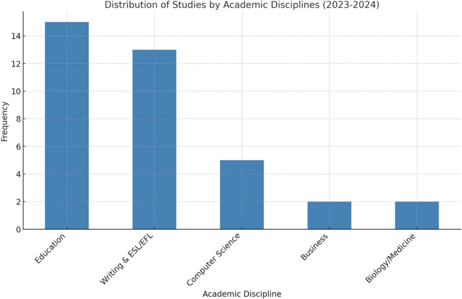 Figure 4 illustrates the distribution of GenAI application studies by academic discipline. To categorize these 37 studies, each was coded based on its primary educational context. Studies with disciplinary overlaps—such as those combining Education with ESL or Computer Science—were classified according to their predominant pedagogical focus. Note that the category"Education"broadly includes studies addressing the process of improving or expanding educational systems, practices, and outcomes, including general or liberal education, teacher preparation, and critical skill development (e.g., creativity, critical thinking, learner autonomy, and prompt literacy).