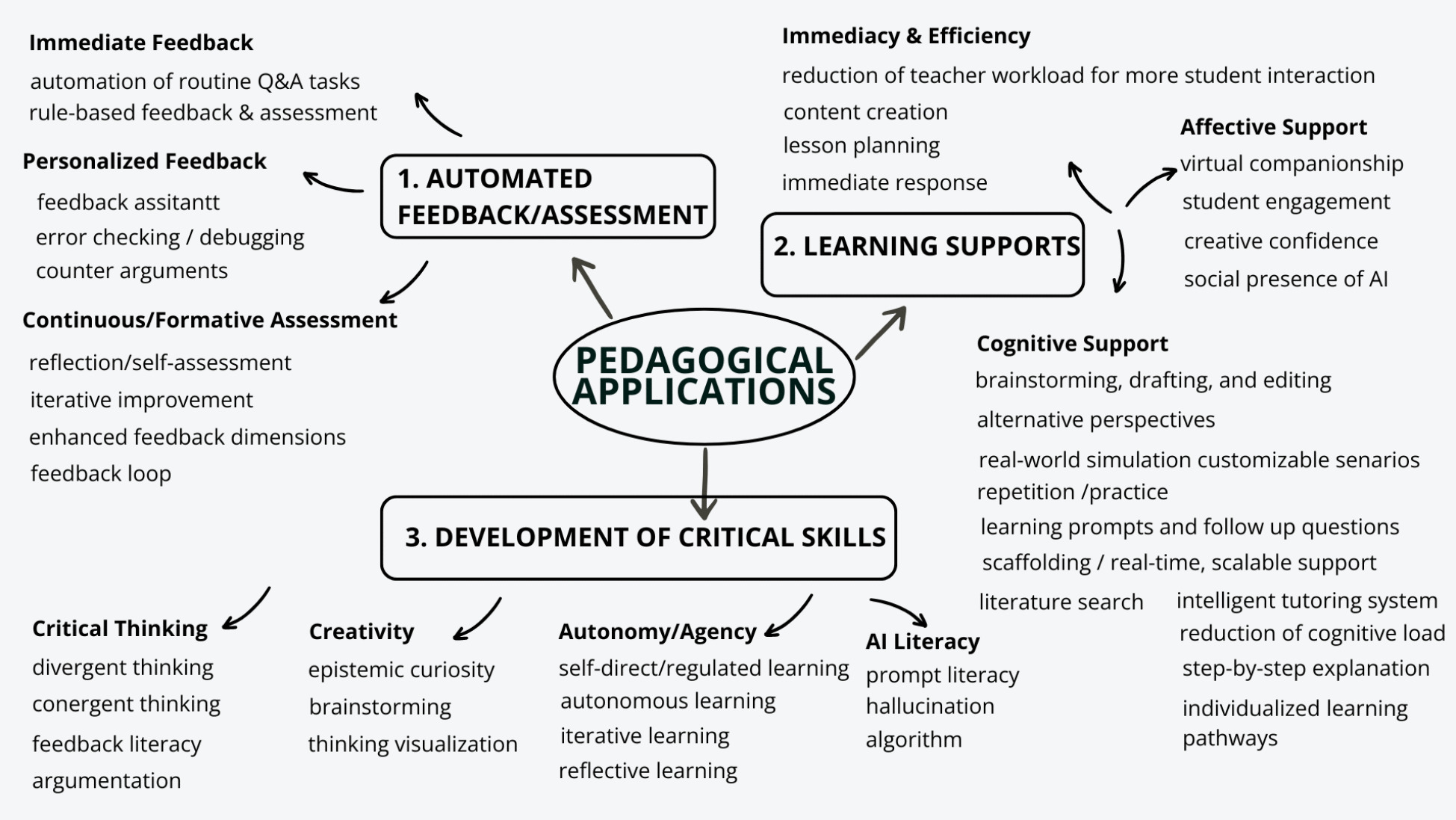 Figure 5 maps the pedagogical applications of GenAI into three distinct yet interrelated themes: (1) automated feedback and assessment, (2) learning supports, and (3) development of critical skills. These themes were designed to ensure mutual exclusivity and collective exhaustiveness by categorizing 42 codes based on their primary instructional purpose. Specifically, automated feedback/assessment focuses on efficiency-driven tasks (e.g., rule-based grading, immediate responses) that reduce educator workload. Learning supports encompass scaffolded interventions (e.g., cognitive aids, affective tools like virtual companionship) that directly assist learners in real time. Development of critical skills prioritizes long-term competencies (e.g., critical thinking, creativity, reflective learning) that transcend immediate task support, fostering metacognitive growth and learner autonomy.
