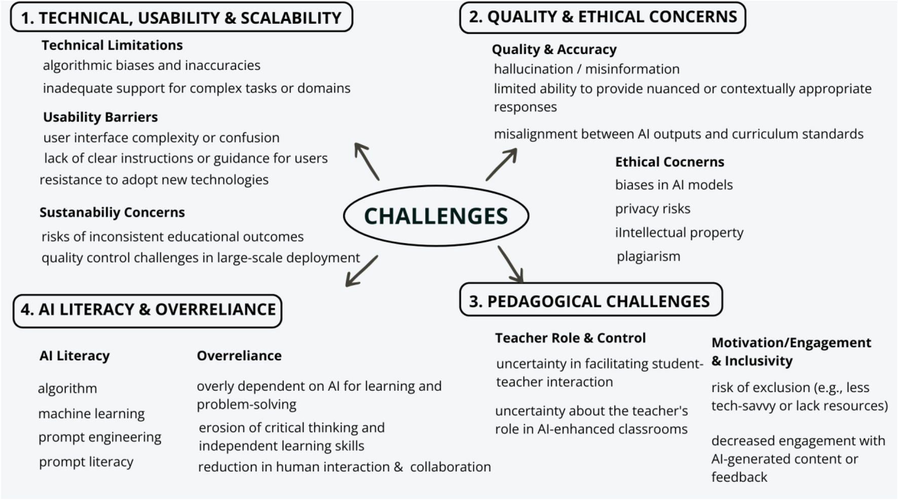 Through a thematic analysis of challenges reported in 37 empirical studies, this section explores critical barriers to integrating GenAI into higher education practices. Twenty-five distinct codes were grouped into four areas: (1) Technical, Usability, and Scalability; (2) Quality and Ethical Concerns; (3) Pedagogical Challenges; and (4) AI Literacy and Dependency. See Fig. 6 for the themes and their codes.
