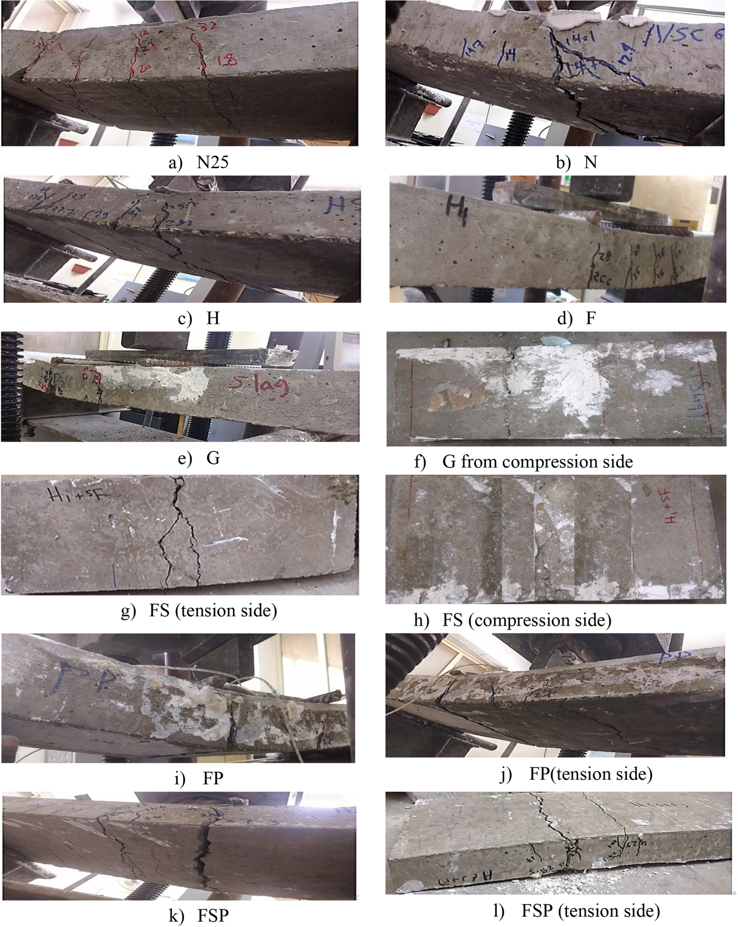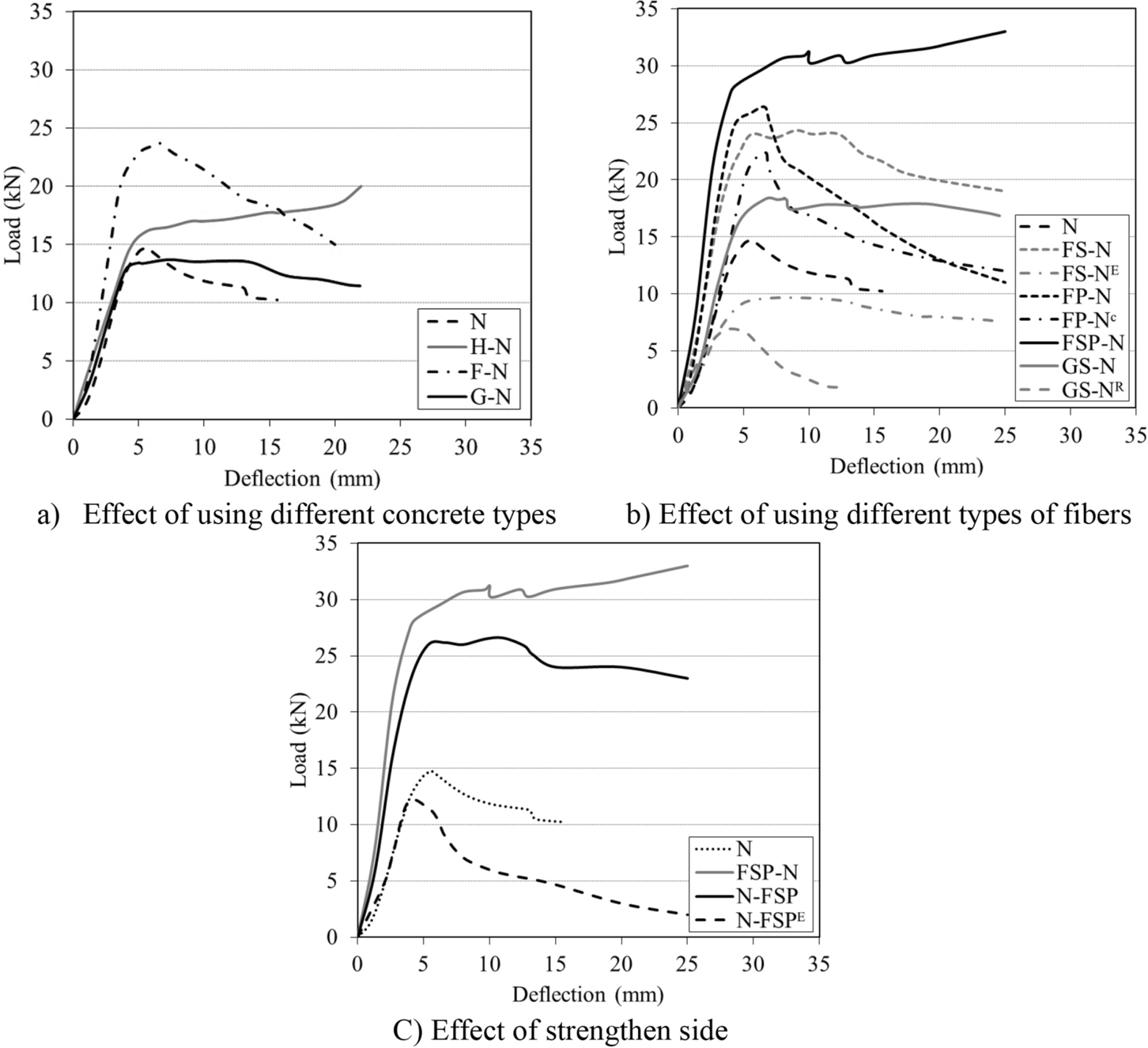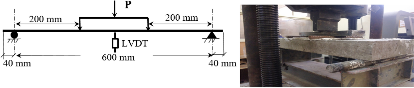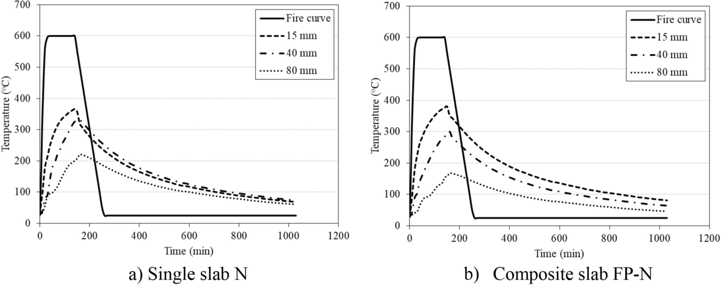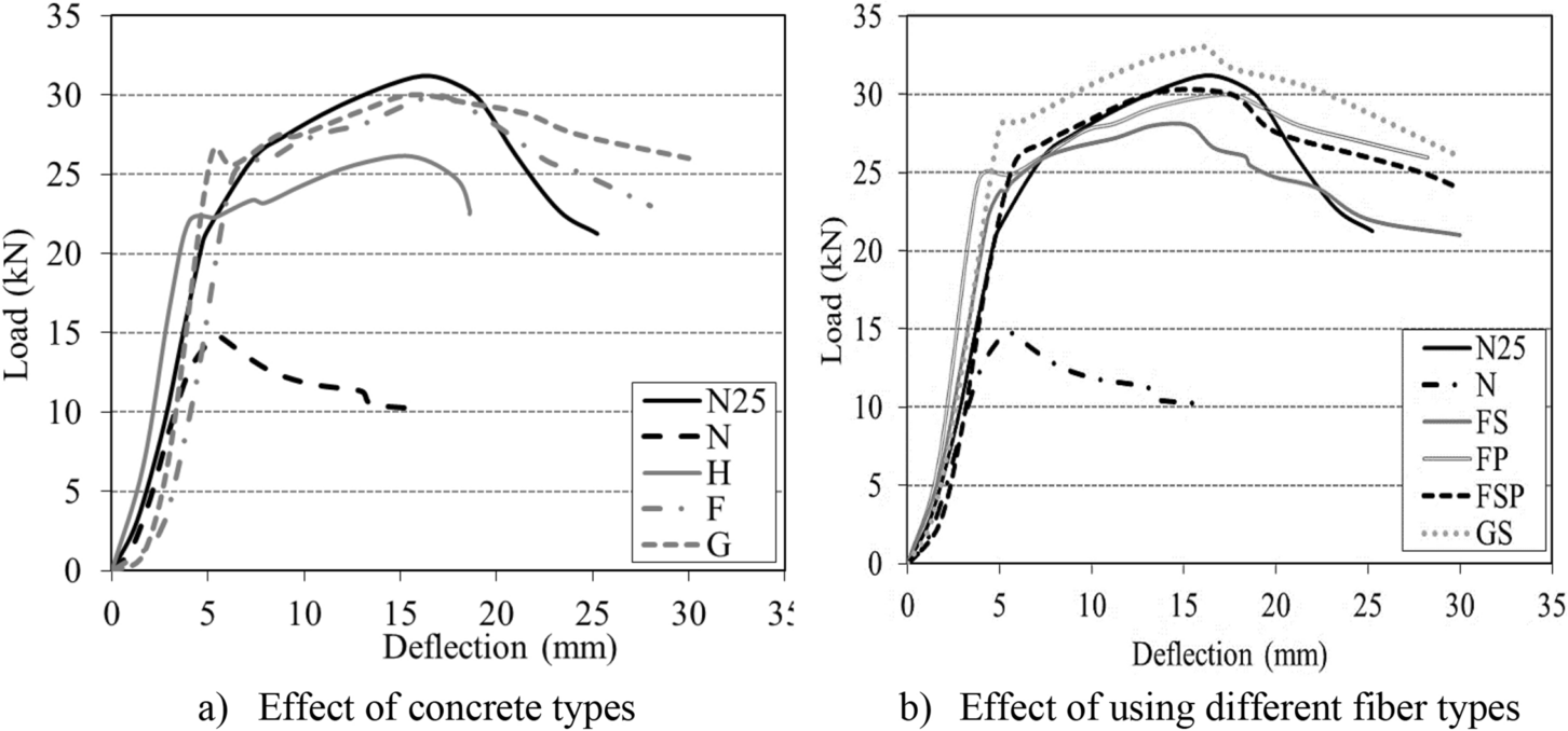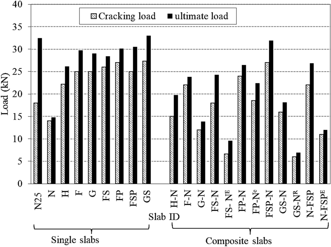 Reinforced concrete as the most important construction material suffers from long-term deterioration due to different exposure conditions. Fire attack is a critical exposure condition as it can lead to complete collapse of the structure. On the other hand, the repair and strengthening of existing structures have become necessary both technically and financially. Moreover, since high-performance concretes (HPCs) are extensively used as repairing or strengthening materials for different structures, their performance after exposure to elevated temperature needs to be investigated. Therefore, this study is directed to investigate the post-fire flexural behavior of RC slabs cast with traditional normal strength concrete (NSC) and strengthened with HPC. Twenty-one RC slabs were prepared and tested including casting the full thickness with the same mixture (single-concrete slabs) and composite slabs (cast with NSC and HPC). Different variables were considered; using high strength concrete, 30% fly ash, 30% slag, 0.5% polypropylene, 0.5% steel fibers, hybrid fibers (0.5% steel + 0.5% polypropylene), reinforcement ratio, the side exposed to elevated temperature (tension or compression), and joining the HPC layer to the NSC (shear studs or epoxy resin). The slabs were exposed to the required temperature of 600°C for 2 h. The results show that strengthening the RC slab in tension or compression by using HPC remarkably enhanced the slab’s performance after exposure to elevated temperature. Specially, composite slabs containing hybrid fibers in tension side when exposed to elevated temperature from the tension side recorded the highest cracking load, ultimate load, stiffness, toughness, and ductility index as compared to the NSC slab, with increases of 92.8%, 116%, 157%, 335%, and 86.9%, respectively.