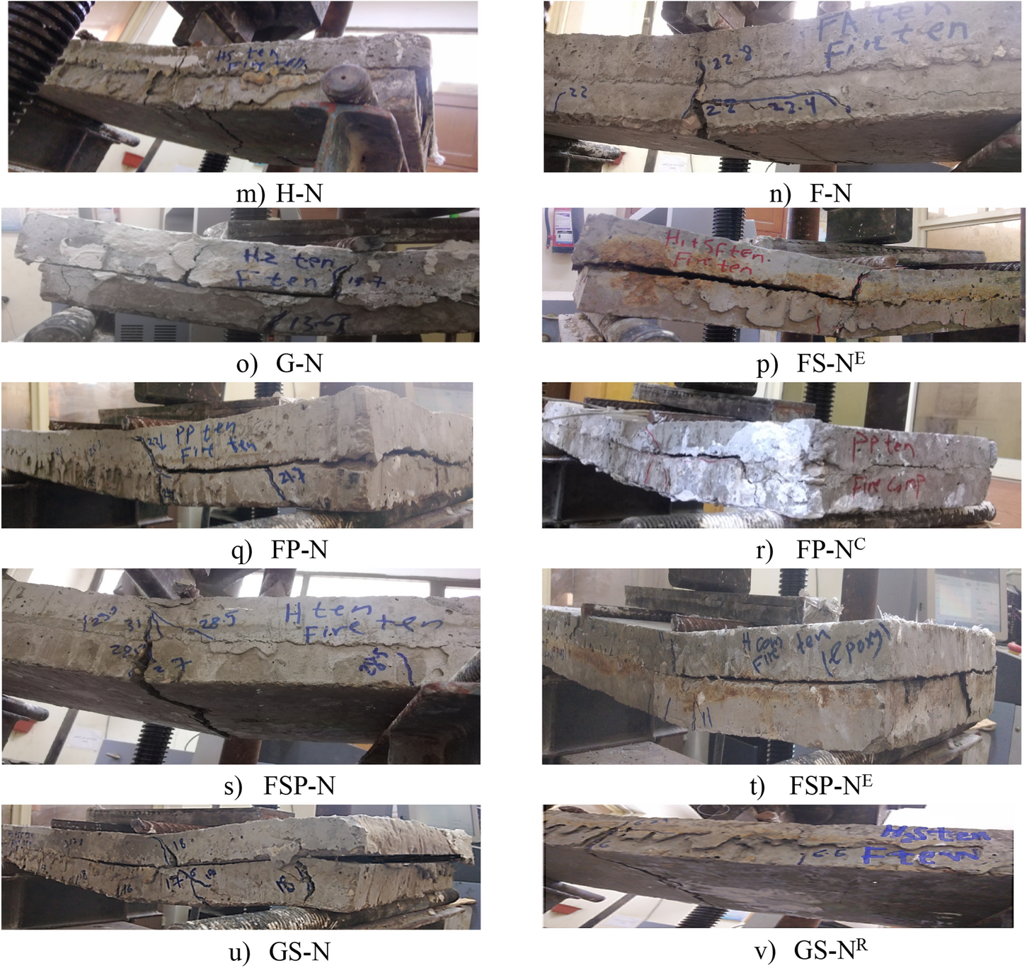 The experimental program of the present study was designed to investigate the flexural behavior of composite RC slab cast with normal strength concrete (NSC) and strengthened with a layer of high-performance concrete (HPC) after exposure to elevated temperature compared to single RC slabs. Various parameters were taken into consideration when preparing and testing specimens including HPC types mainly; high strength concrete (HSC), (replacement 30% of cement by fly ash or ground granulated blast furnace slag), 0.5% steel fiber (SF) or polypropylene fiber (PPF) and hybrid fibers (0.5% SF + 0.5% PPF), strengthening side (tension or compression), the fire exposure side (tension or compression sides), reinforcement ratio (0 and 0.6%), and bonding the HPC layer to the NSC (using shear studs or epoxy resin).