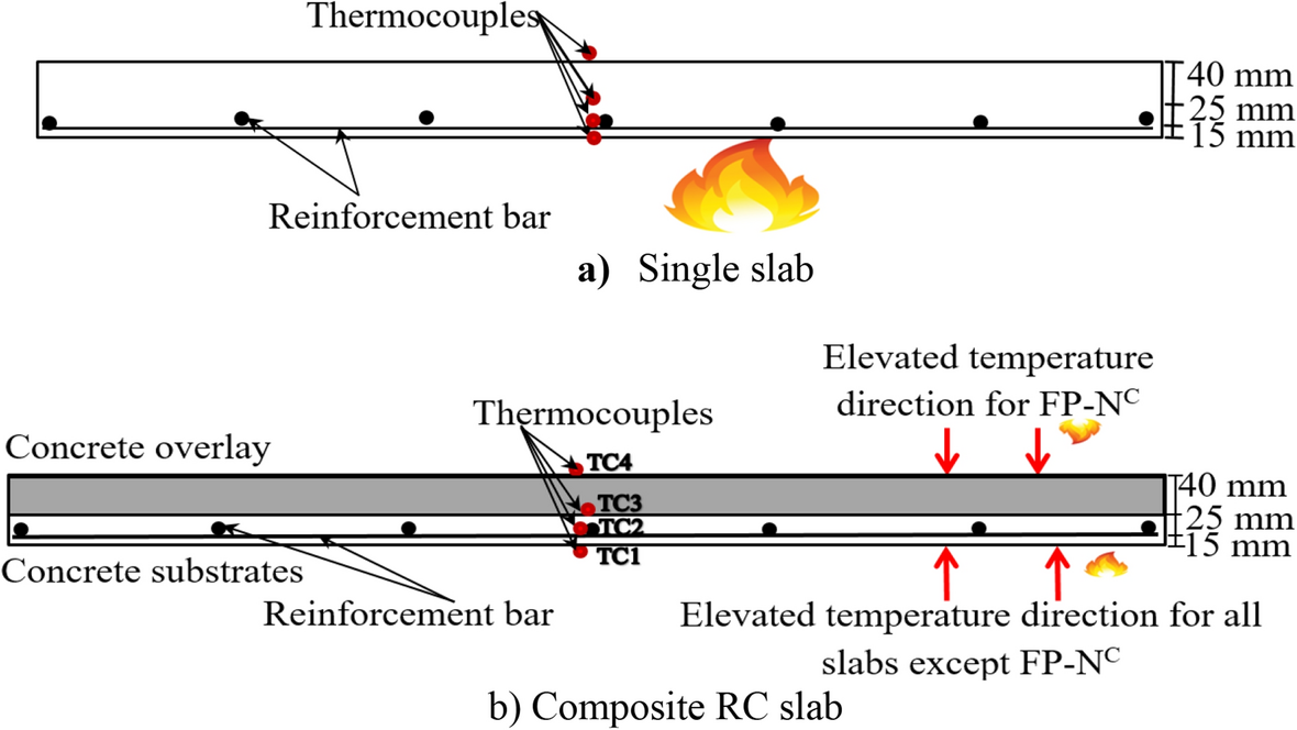 The above review mentioned that numerous studies have been conducted to evaluate the fire performance of HSC members. However, a few studies have explored the influence of fly ash and ground granulated blast furnace slag with fiber on the fire performance of RC members. Thus, the aim of this investigation is to study the fire performance of single-concrete and composite slabs cast with different HPC. This study will help engineers understand the in-situ behavior of the RC member strengthened with HPC when exposed to elevated temperatures and consider such performance when designing and implementing such materials in such situations to ensure their safety. Furthermore, the generated data on the fire behavior of RC slab strengthened with HPC layer will help validate finite element models to track the flexural behavior of RC slab strengthened with HPC under fire.