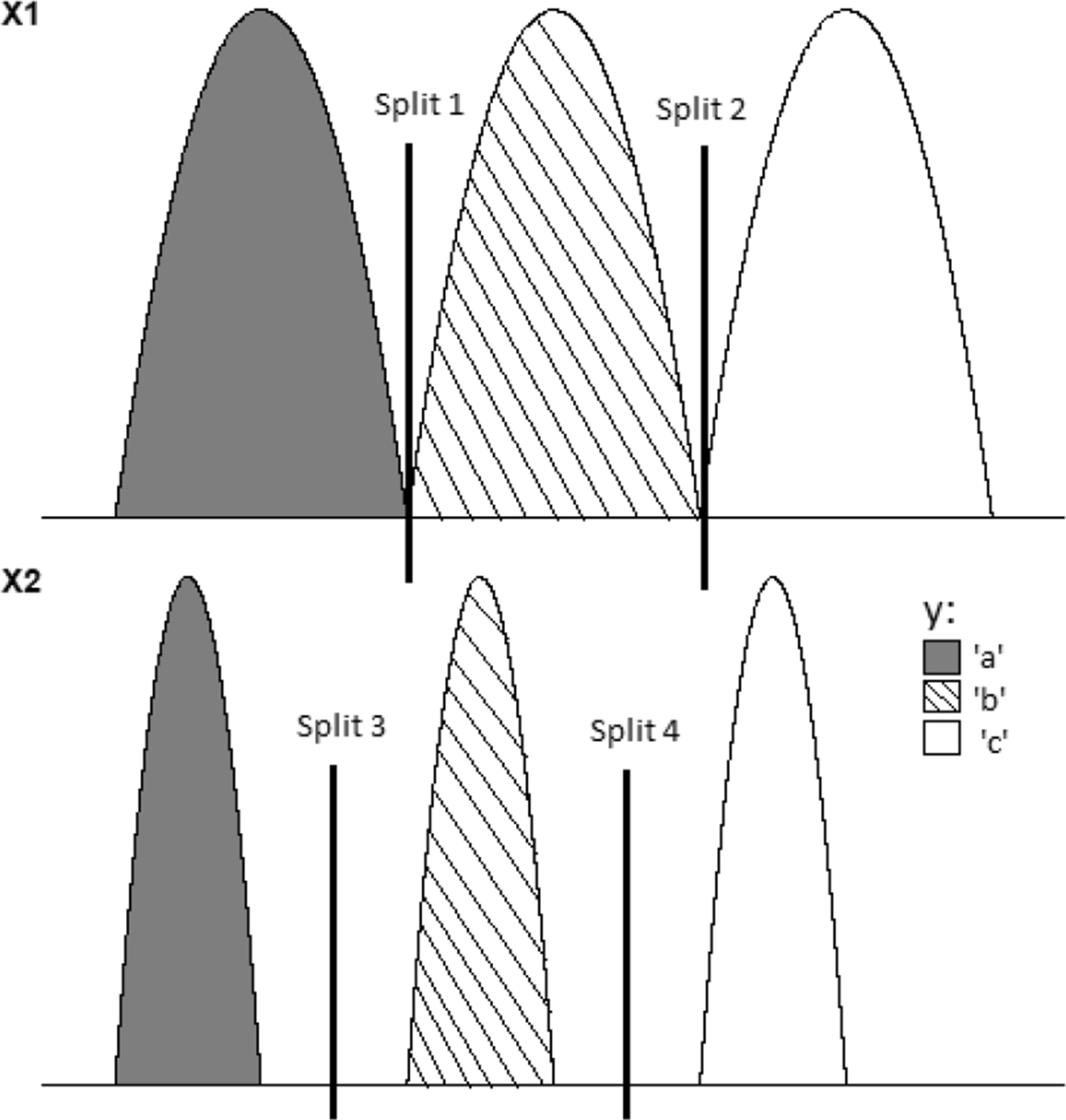 As shown in Fig. 1, two explanatory variables X1 and X2 are considered. The target variable Y assumes three possible values a, b, and c, corresponding to three different groups. Figure 1 shows the distribution of the two explanatory variables in the three groups determined by Y.