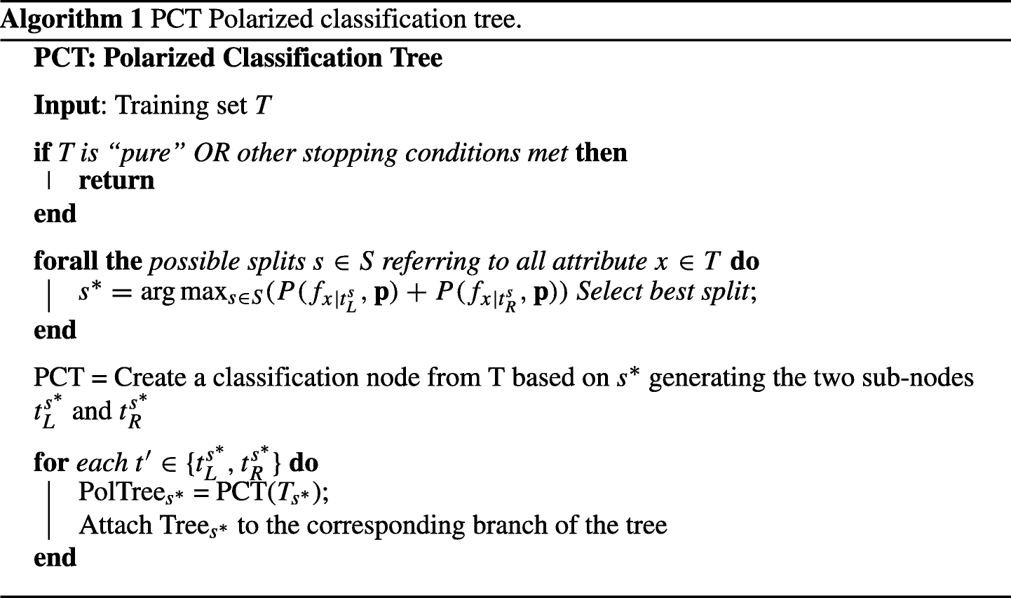 The contribution of the paper is twofold: from a methodological perspective, a new multidimensional polarization measure is proposed; in terms of computation, a new algorithm for classification tree models is derived which the authors call Polarized Classification Tree. The new measure, based on polarization, tackles weaknesses of the classical measures used in classification trees (e.g., Gini index and Information Gain) by reflecting the distribution of each covariate in the node.