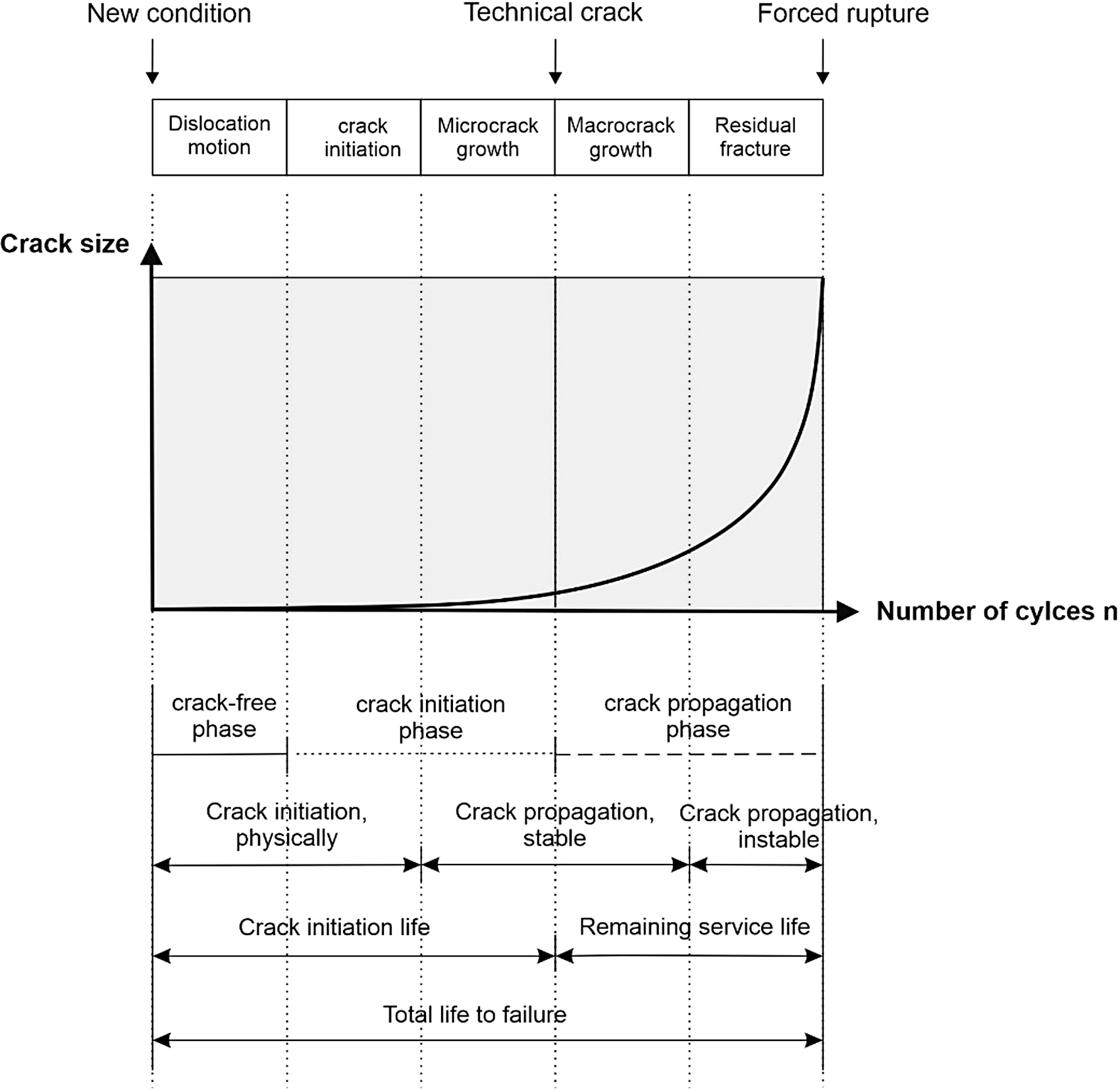Steel failure under fatigue loading can be divided into three phases (Fig. 1). The first phase is crack initiation and micro-crack growth (crack initiation). Then the crack enlarges under cyclic loading (stable crack propagation) and ends with residual fracture (unstable crack growth).