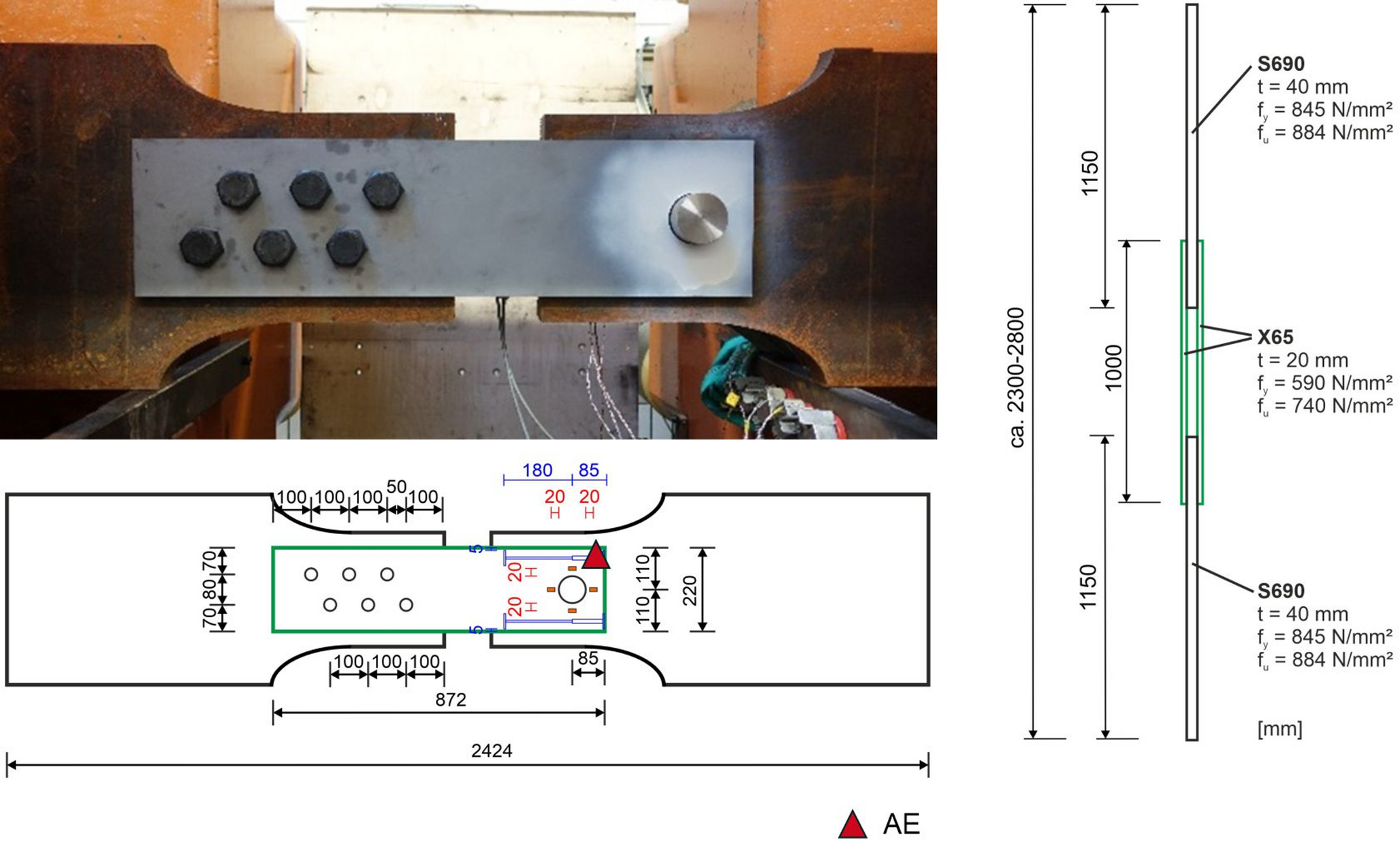 The steel strains in the area of the 70 mm bolt connections were measured using four strain gauges (SG) positioned approximately at 90° around the pin. Additionally, an AE sensor was applied (Fig. 2).