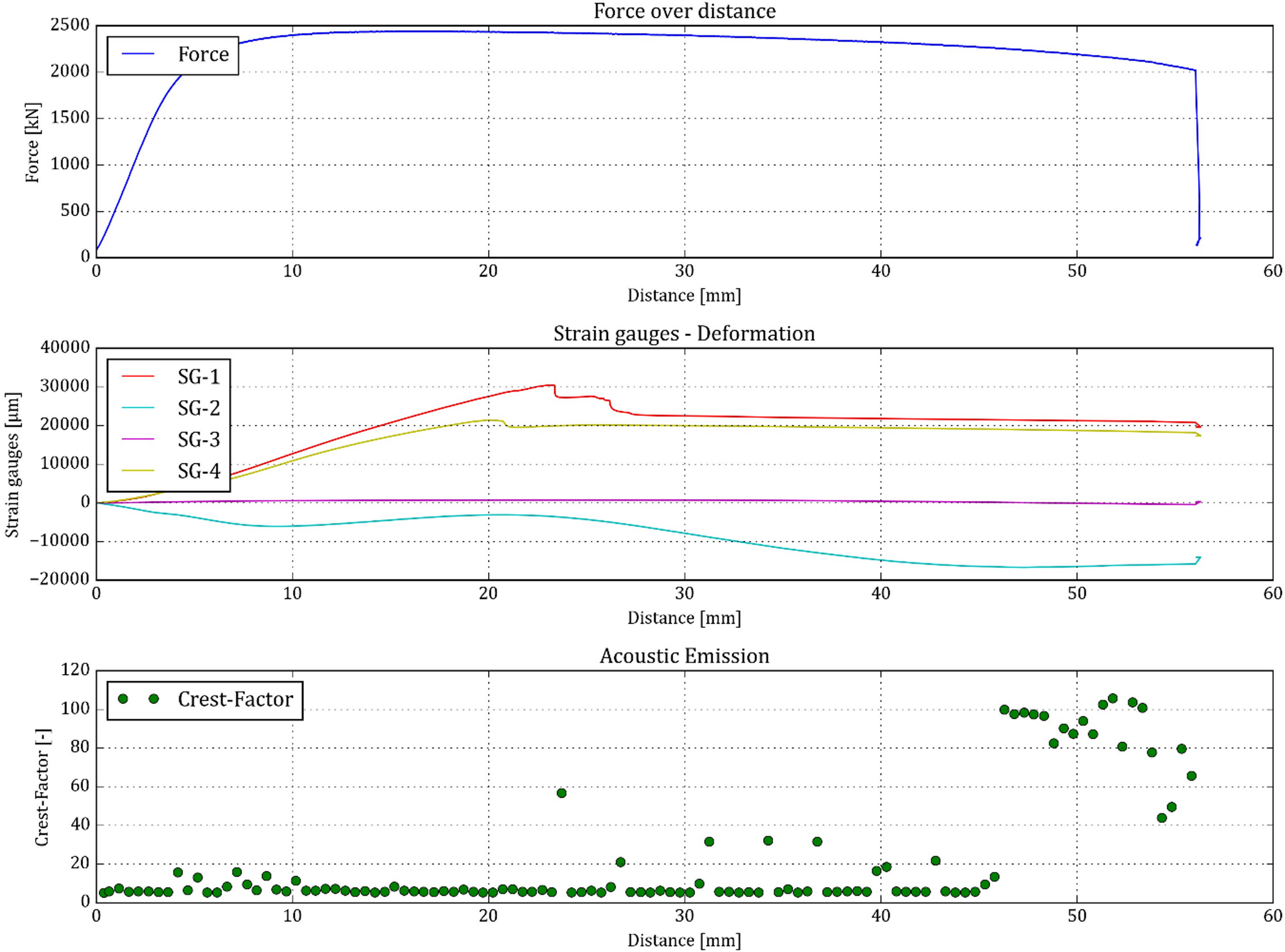 The AE measurement also indicates that the crest factor shows initial significant deflections in the early yielding phase (up to 10 mm) and then, shortly before specimen failure, a high signal density emerges, indicating massive crack formation due to sliding processes in the steel base material (dislocation dynamics). Even after reaching the maximum load (beyond 25 mm), distinct signal fluctuations were observed.