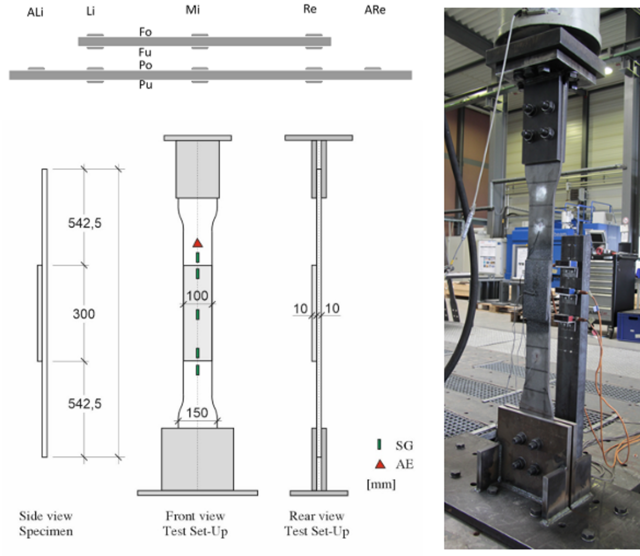 The static tests were performed under displacement control at a rate of 1 mm/min until fracture. The fatigue tests were conducted with a stress ratio of R = 0.1 and test frequencies ranging from 2 to 3 Hz, with a sampling rate of 50 Hz. The depicted test setup shows the steel dog bone specimen with a single-sided bonded steel patch; an AE sensor was placed on the backside of the steel specimen near the repaired crack. The AE measurement by the Institute for Advanced Mining Technologies (AMT) was carried out continuously during testing at a sampling rate of 1 MHz.