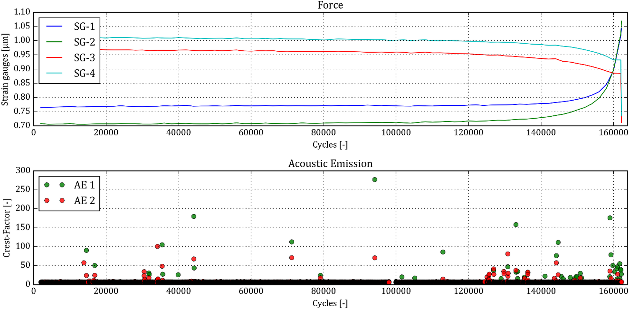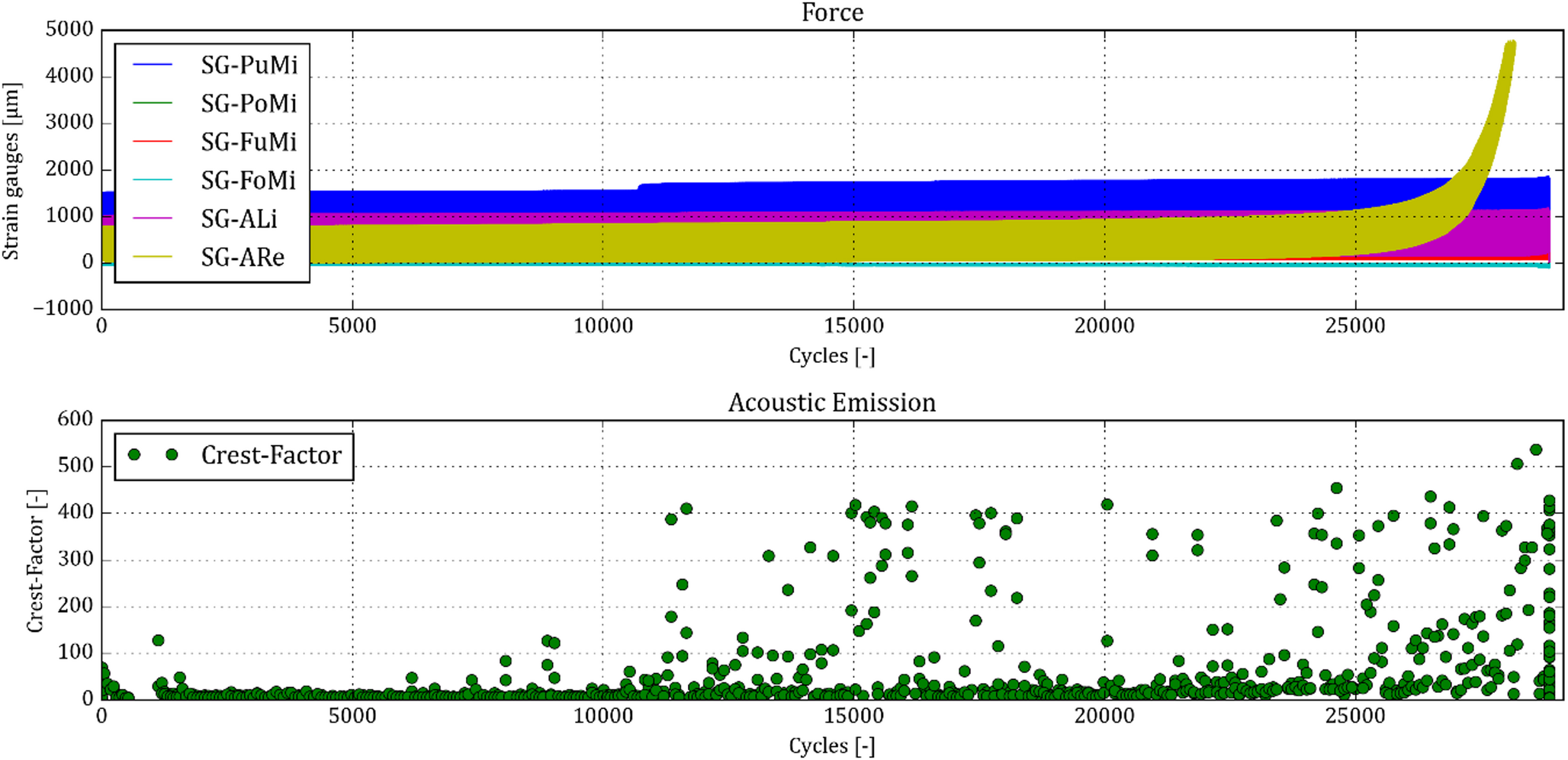 Crack detection is crucial in experimental fatigue studies. In addition to fracture and loss of stiffness, the initiation of a crack is an important possible failure criterion for concluding a fatigue test. The detection of a crack can be done via the local strain change in the test section, if strain gauges are applied at the relevant points, see e.g [13, 34]. Alternatively, magnetic particle inspection or dye penetrant inspection can be used at regular intervals during the test to detect external cracks, but this is a more extensive active inspection method. Internal cracks can be detected to some extent by ultrasonic testing, but also only as a snapshot. As a passive measuring system, a potential measurement can be carried out in addition to the elongation measurement, in which a change in the resistance of a sample is registered.