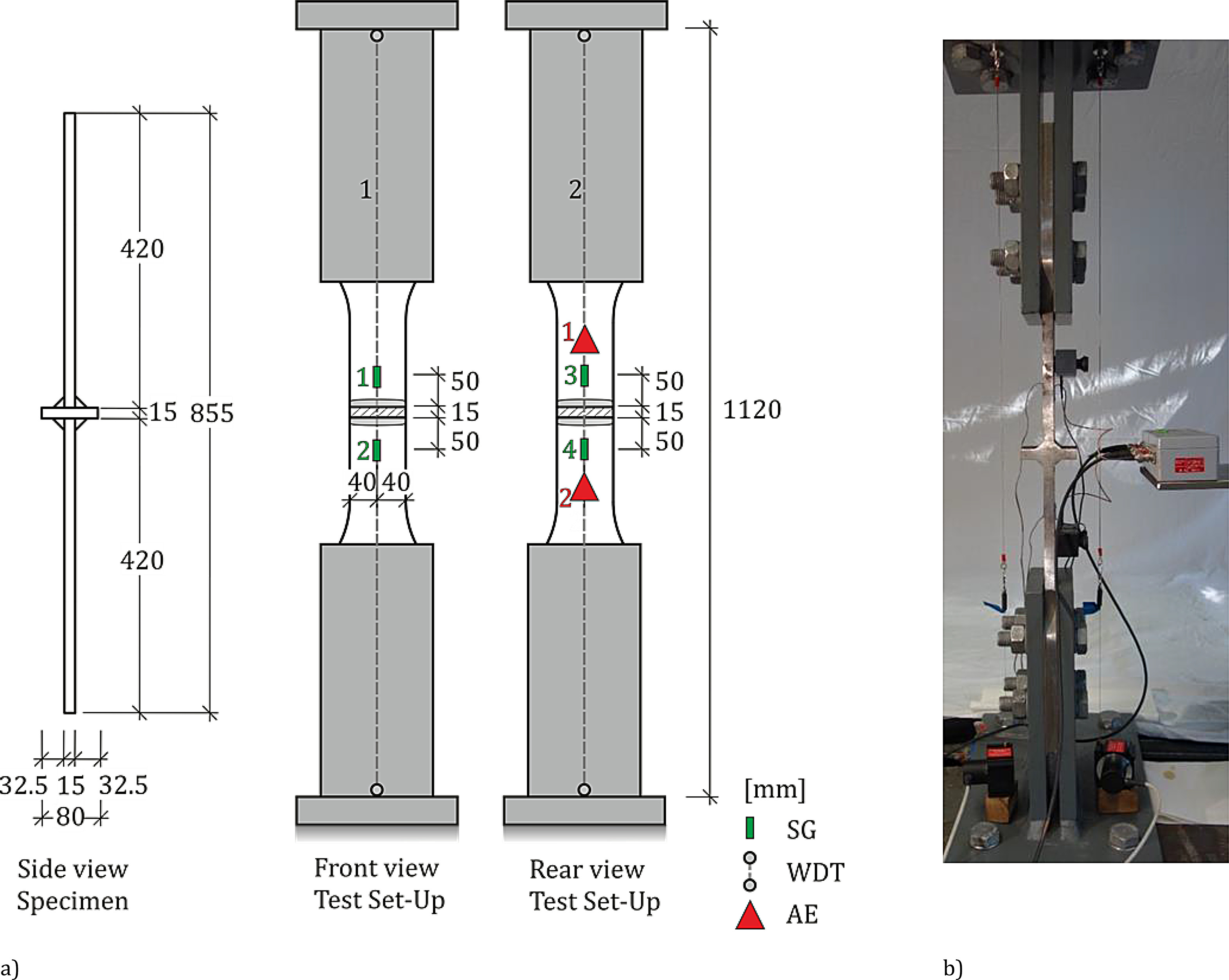 As part of the AiF/DASt/FOSTA project “EVOKERB – Evolution detail catalogue for economically optimised steel structures” [40‐45], fatigue tests were carried out at RWTH Aachen University on cruciform joints with different weld designs accompanied by AE measurements. The aim of the experimental investigations was the analysis of weld imperfection influences on the fatigue resistance of typical steel details. The cruciform joints have been tested under tension at different stress ranges with a stress ratio of R = 0.1. The stress-controlled load frequency was set to 2 to 3 Hz. (1 cycle per second). Figure 6 illustrates the experimental setup of the specimen. Different measuring instruments including strain gauges (SG), wire displacement transducer (WDT), and displacement measurement of the test cylinder were applied to the specimens. The measuring of these sensors recorded 100 cycles at intervals of 1000 cycles with a recording frequency of 60 Hz [43]. One AE sensor was attached via magnets at the upper and lower end of the specimen. The AE measurement was performed at 2 MHz and continuously recorded an acoustic signal for each sensor.