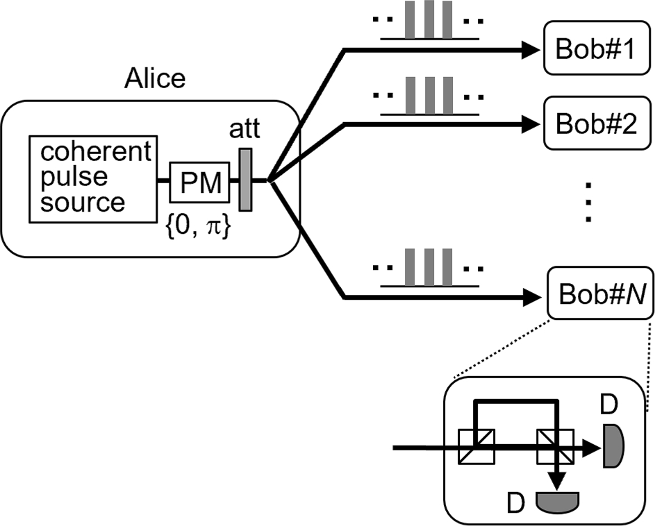 The setup of the proposed DPS-QCKA is illustrated in Fig. 1. A transmitter (Alice) broadcasts a weak coherent pulse train to receivers (Bobs), in which each pulse is phase-modulated by 0 or π and has a mean photon number of less than one. Bobs detect the transmitted signal using a delay Mach–Zehnder interferometer with a delay time equal to the pulse interval, at the output of which threshold single-photon detectors are placed. Using this apparatus, Bobs measure the phase differences between adjacent pulses, which are 0 or π. Here, measurement results are obtained occasionally and randomly in time owing the small photon number of the incoming pulses. When the measured phase difference is 0 (or π), they create bit 0 (or 1) while recording the clicking time slot and created bit.
