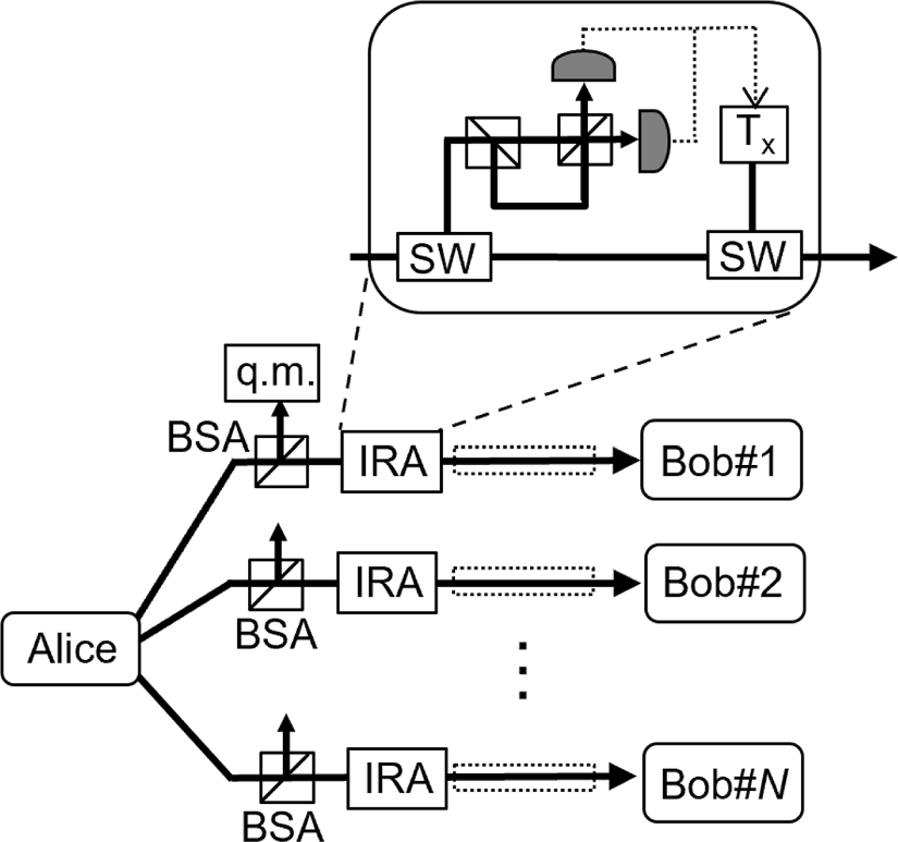 Another QCKA protocol that seems the most practical is one in which one sender sends identical quantum states of {|0 > , |1 >} and {|+ > = (|0 > +|1 >)/\(\sqrt {2}\), |– > = (|0 > – |1 >)/\(\sqrt {2}\)}, i.e., states used in BB84-QKD, to multiple recipients simultaneously, from which the recipients create key bits [17]. The sender and receivers can share a common secret key with one quantum transmission from the sender to recipients, and no additional QKD transmission is required in this protocol. This QCKA scheme is a simple extension of BB84-QKD, which has been intensively studied and developed and is the most practical quantum communication system.