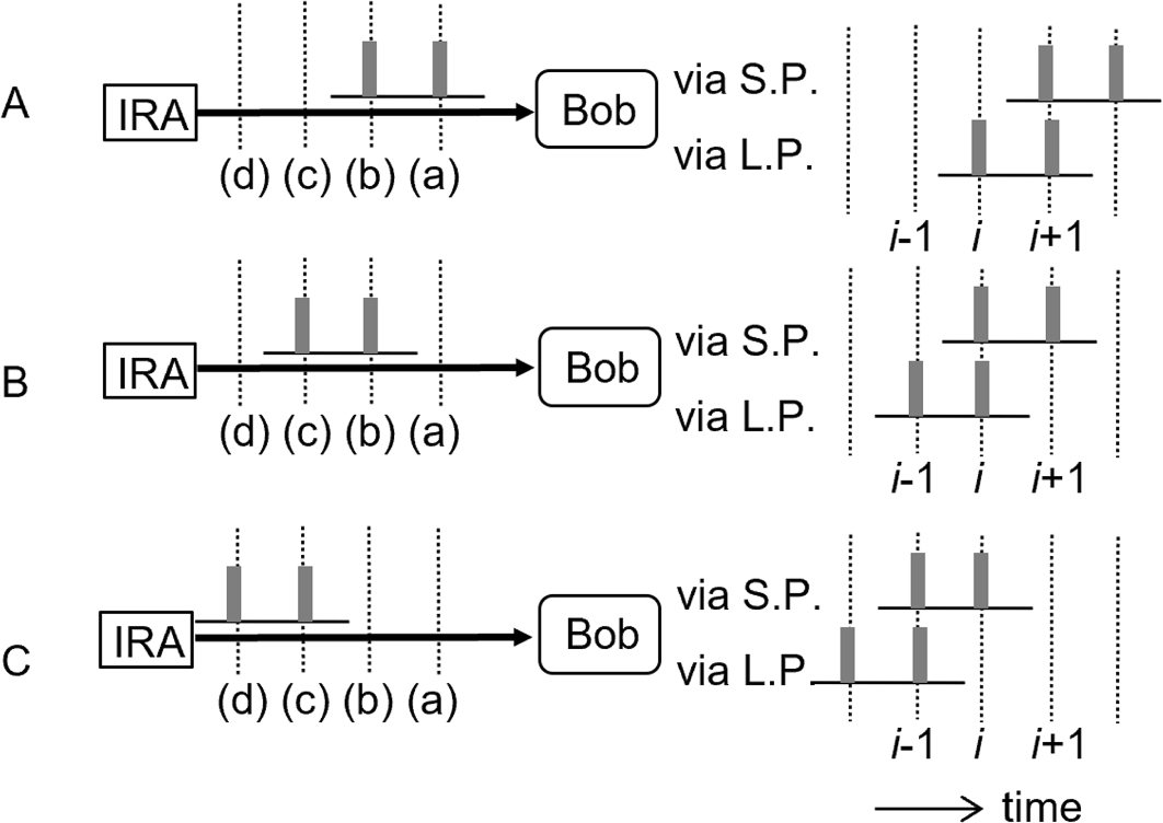Pulse patterns when IR attack is conducted. IRA denotes intercept-and-resend attack, and S.P. and L.P. stand for the short and long paths, respectively
