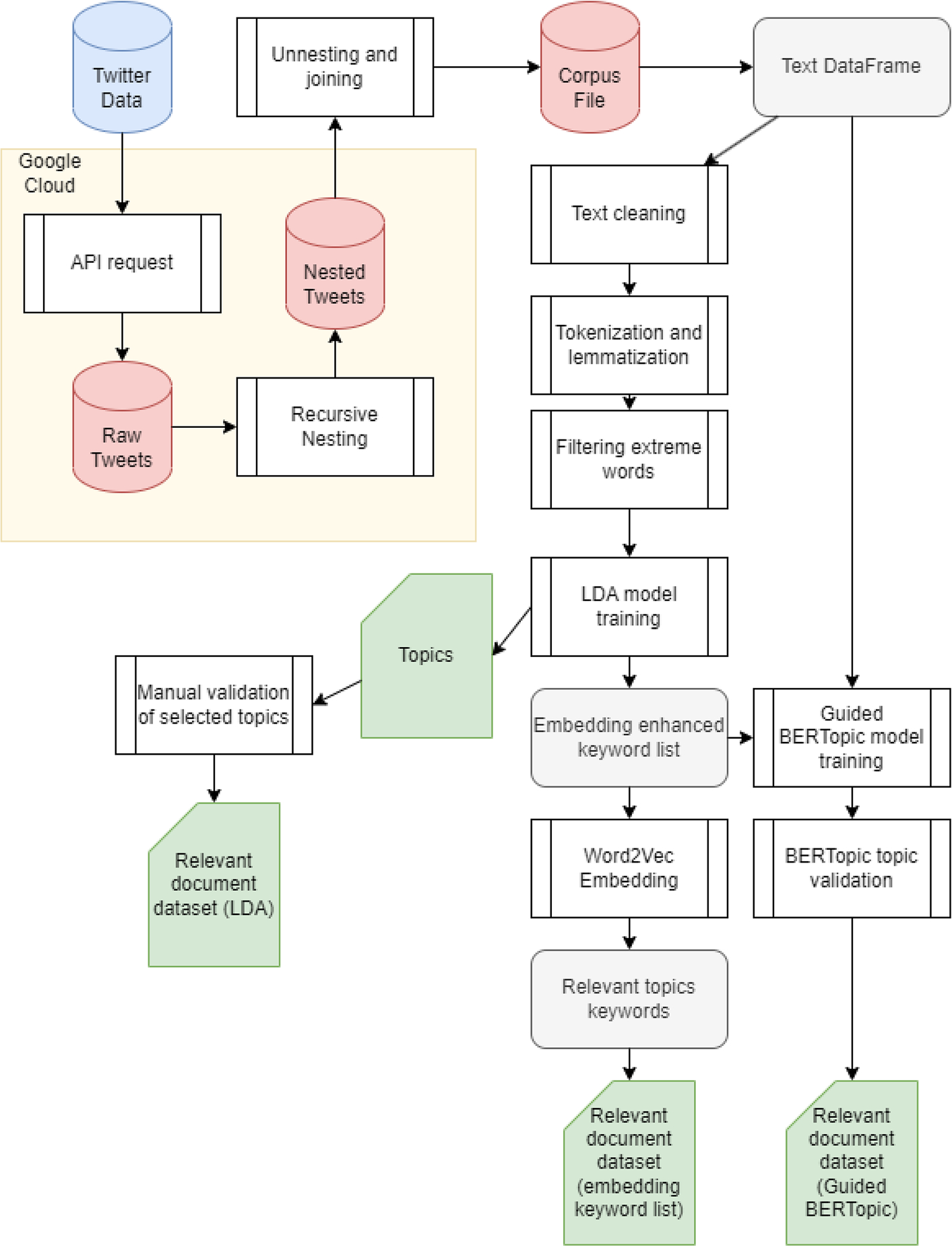 Due to the massive amount of data collected and Twitter’s API and computing power limitations, we conducted this step on a Google Cloud cluster with three virtual machines. This decision allowed us to maintain continuous usage of computing resources during the collection and nesting process and ensured fault-tolerance.