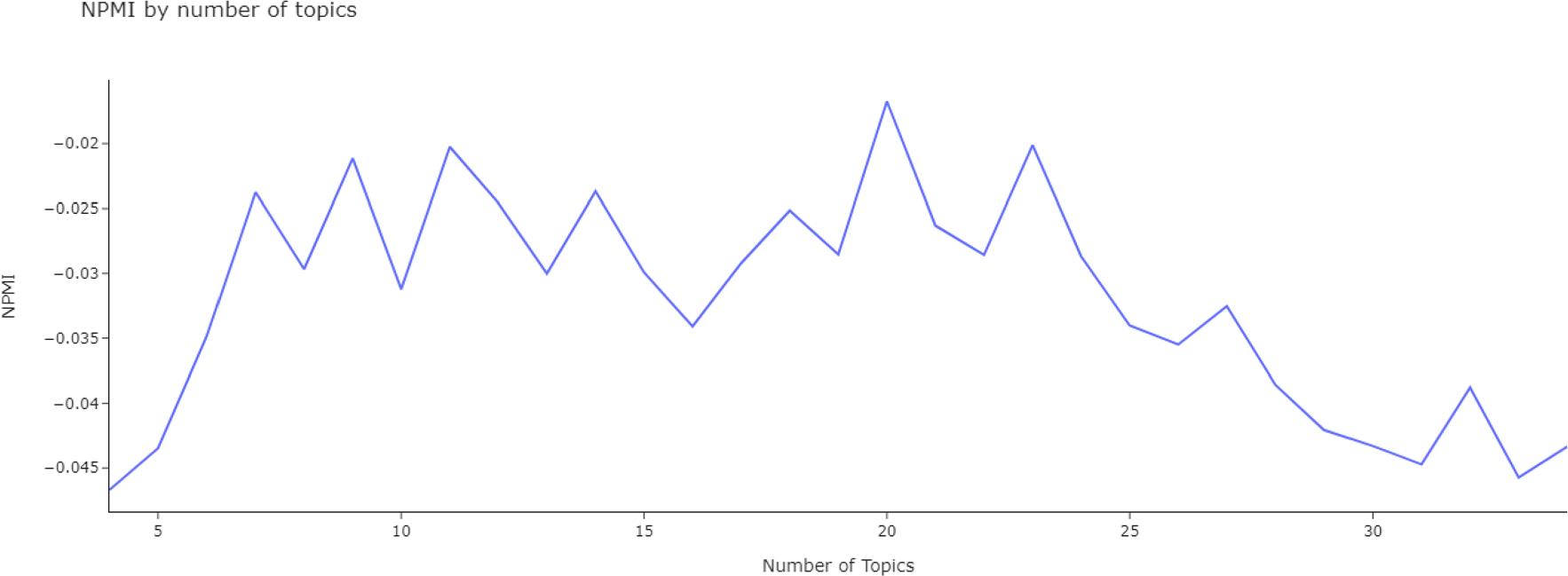 In order to determine the optimal number of topics, the study used the normalized pointwise mutual information metric. This metric evaluates the topic model by representing the top-n words of each topic as a vector in a semantic space, calculating their probability of co-occurrence with each other and weighting these vectors by the NPMI of each term. It is important to experiment with a higher number of topics to identify a specific and narrow topic while still producing interpretable results. In this study, we utilized the Python Gensim (Rehurek and Sojka 2011) libraries for LDA and its performance metrics, such as coherence and NPMI.