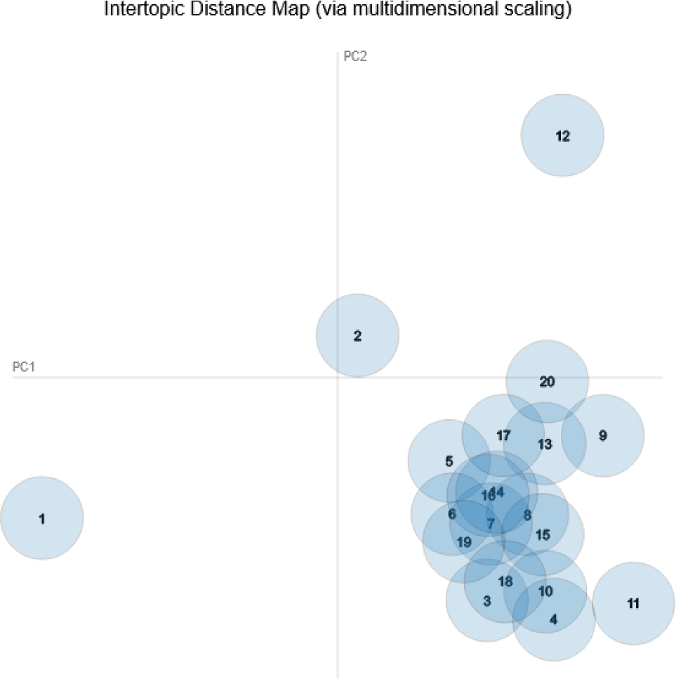 In our experiments, we observed that using 20 topics (represented by their intertopic distance in Fig. 3 resulted in the highest NPMI value, with the metric steadily decreasing beyond that number. While fewer topics also yielded decent NPMI results, they failed to adequately capture distinct niches within the dataset, which was necessary for our specific research goal. Given that the topic of interest was not a prevalent theme in the tweets, employing a larger number of topics allowed for more specific and targeted discussions, facilitating the filtering of tweets unrelated to the theme of reactions to scientific communication.