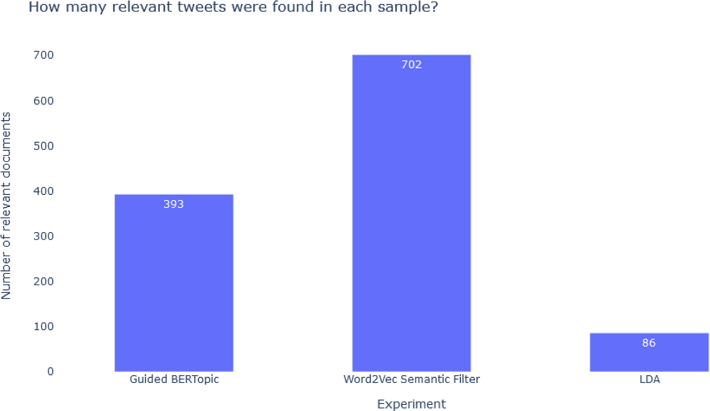 With three same-sized datasets, we can then compare our different techniques in their capability of filtering a large dataset in search of documents of a niche theme (Fig. 5).