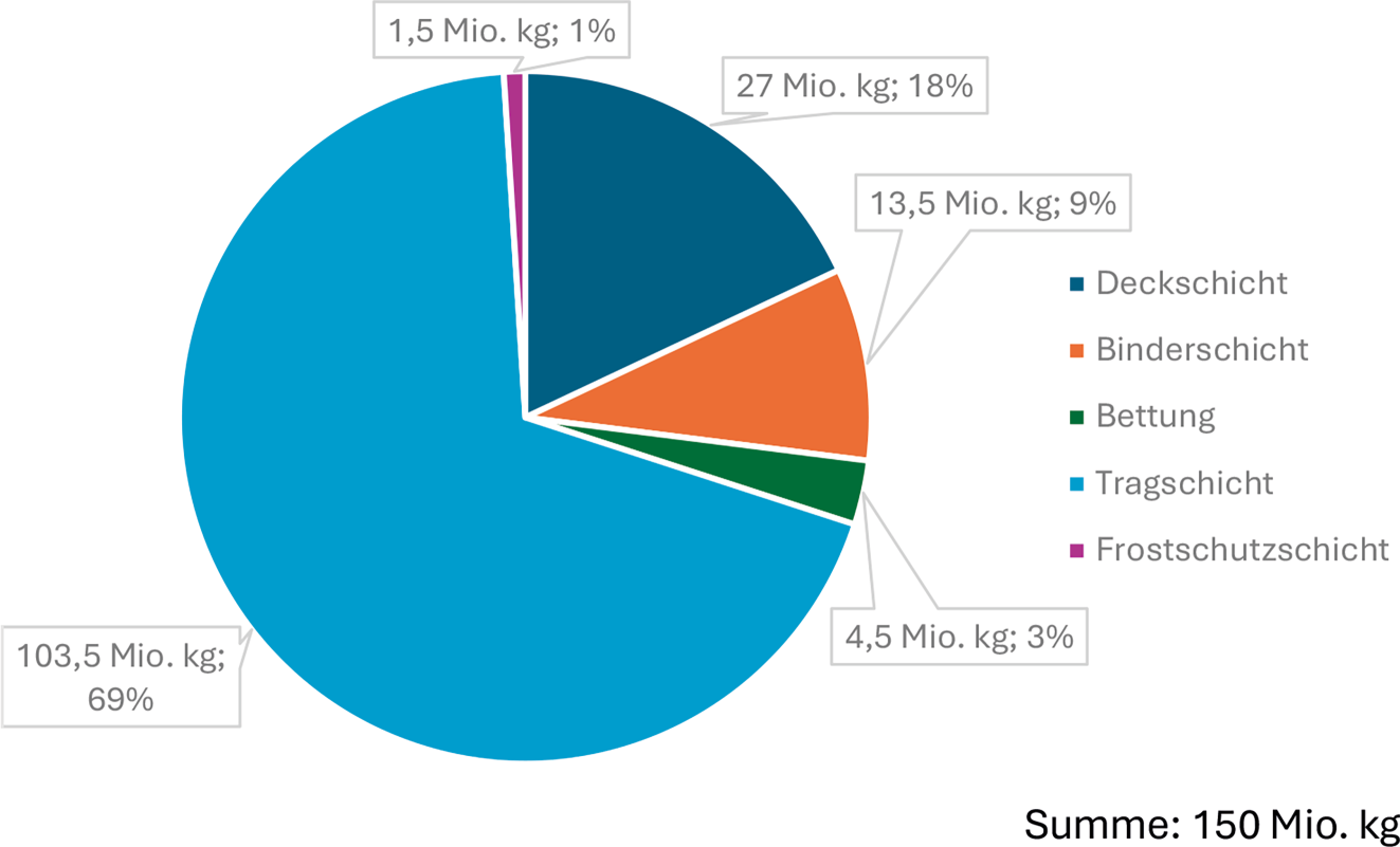 Der Bausektor hat, im Hinblick auf eine effiziente und wirtschaftliche Ressourcennutzung, eine sehr große Bedeutung. In Deutschland werden große Mengen (572 Mio. Mg in 2022) mineralische Naturstoffe abgebaut und zur Herstellung von neuen Baustoffen verwendet (Statistisches Bundesamt (destatis) 2025). Ungefähr die Hälfte wird für den Erhalt und den Neubau der Infrastruktur verwendet – ca. 42 Mrd. € von 109 Mrd. € Umsatz des Baugewerbes stammen aus dem Tiefbau (Stand 2022; Statistisches Bundesamt (destatis) 2023). Gleichzeitig fallen in diesem Sektor ca. 140 Mio. Mg/a vorwiegend mineralische Abfälle an (Bundesverband Baustoffe – Steine und Erden e. V. 2024), was 35 % der Gesamtabfallmenge in Deutschland ausmacht (Stand 2022; Statistisches Bundesamt (destatis) 2024). Zwar werden ca. 90 % der Bau- und Abbruchabfälle verwertet, dabei handelt es sich jedoch meist um Maßnahmen im Straßen- und Landschaftsbau oder die Nutzung auf Deponien bzw. im Bergbau als Verfüllmaterial (Stand 2022; (Bundesverband Baustoffe – Steine und Erden e. V. 2024)). Um den hohen Ressourcenbedarf des Bausektors langfristig decken zu können, sind somit Maßnahmen zur Steigerung der Ressourceneffizienz z. B. durch Kreislaufführung von Materialien nötig.