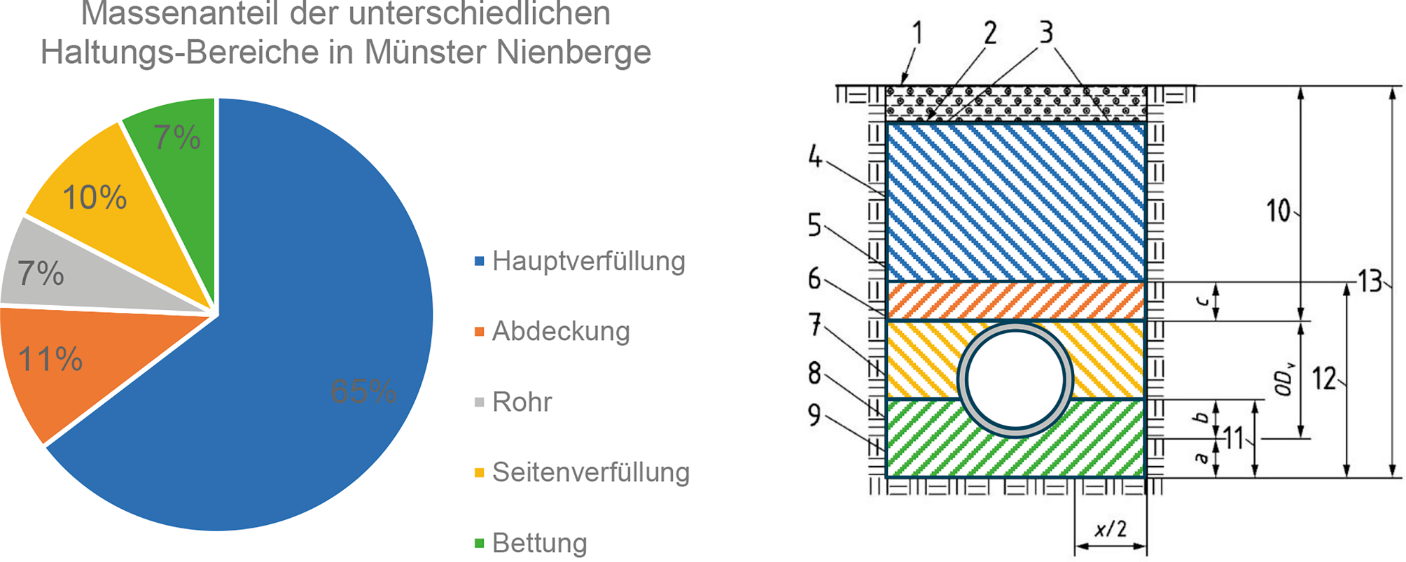 Etwa 90 % der Kanalisation in Münster Nienberge liegen unter Verkehrsflächen. Dieser Faktor muss bei der getrennten Berechnung der Massen von Verkehrsflächen und Kanalisation berücksichtigt werden, um eine Doppelung der Massen in diesem Bereich zu vermeiden. Um dies zu berücksichtigen, kann auf der Betrachtungsebene ein Korrekturfaktor bzw. -wert für die Hauptverfüllung ermittelt werden. Dieser ergibt sich aus der Dicke der Verkehrsflächen, multipliziert mit der Breite des Grabens (der jeweiligen Haltung) und dem Anteil der Haltungen unter einer Verkehrsfläche im Betrachtungsgebiet. Dieser korrigierte Wert liefert auf der Netzebene, d. h., wenn ein größerer Bereich mit mehreren Objekten betrachtet wird, einen plausiblen Schätzwert. Auf Objektebene, d. h. bei Betrachtung eines einzelnen Objekts, kann dieser Mittelwert von den tatsächlichen Gegebenheiten stark abweichen.
