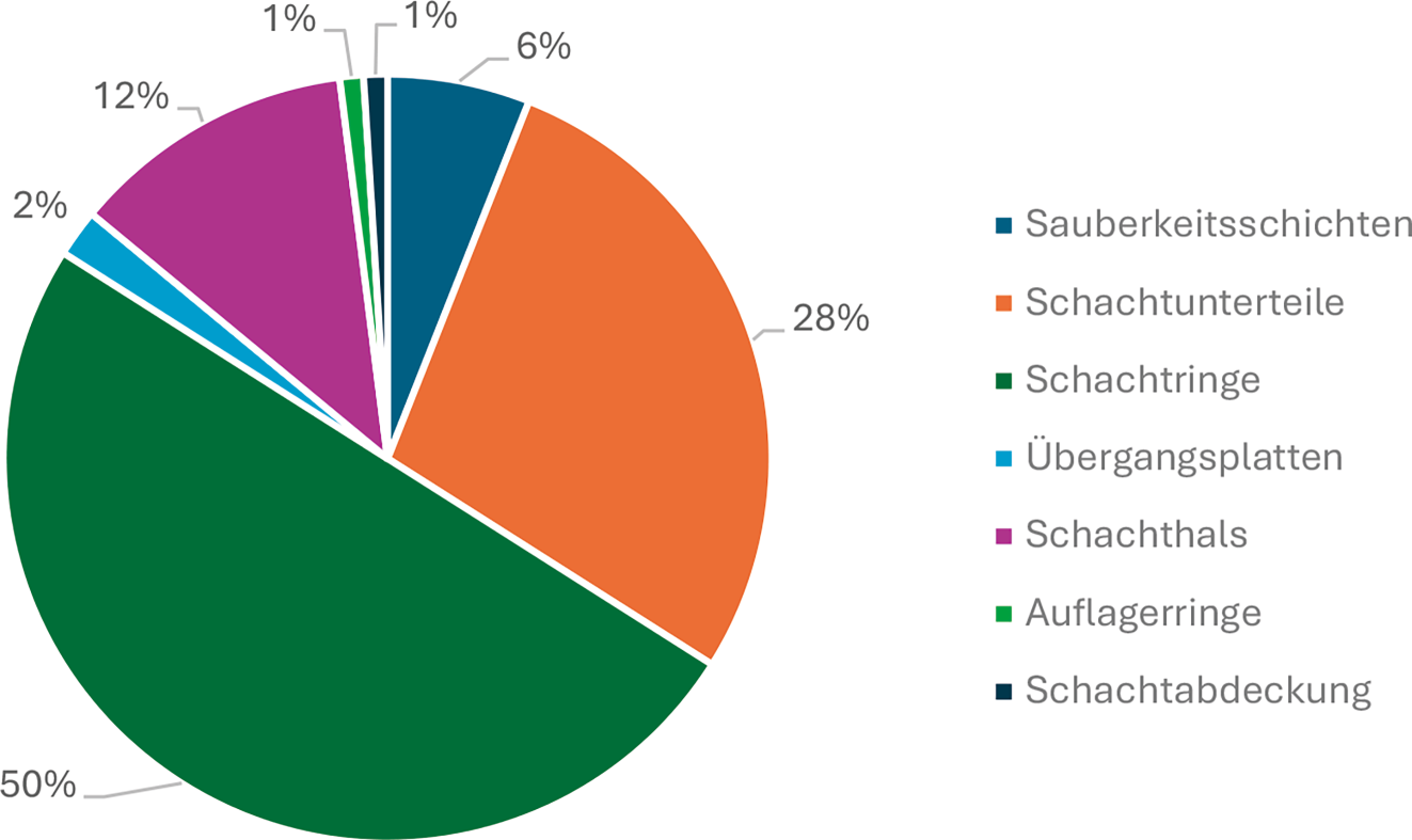 Die Gesamtmasse der Schächte in Münster Nienberge beträgt rund 10.000 Mg, wobei 5 % (52 Schächte) nicht berücksichtigt wurden. Diese Schächte waren nicht vollständig dokumentiert (fehlende Basisattribute) oder bestanden aus Sonderbauteilen, sie nicht in der Konstruktionsdatenbank hinterlegt sind. In Abb. 4 ist die Massenverteilung auf die unterschiedlichen Bereiche dargestellt.