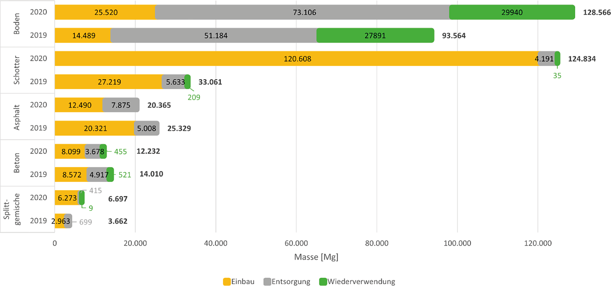 In Summe wird deutlich, dass durch Erschließungs- und Neubaumaßnahmen mehr Material eingebaut als ausgebaut wurde. Im Jahr 2019 wurde fast der gleiche Anteil mineralischer Materialien entsorgt wie eingebaut.