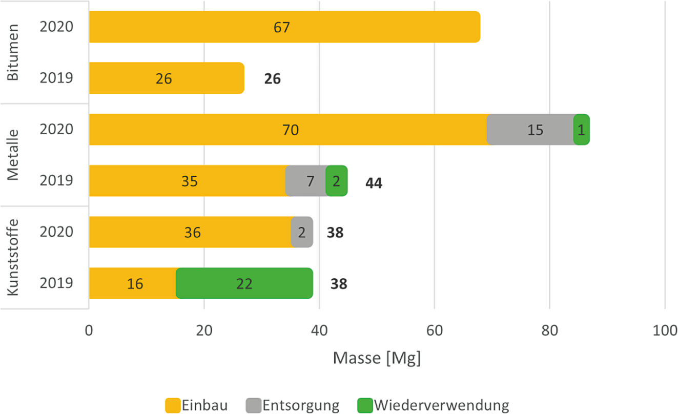 Abb. 5 und 6 zeigen zudem, um welche Art von Stoffstrom es sich handelt. Bei allen Materialarten bildet der Einbau von Materialien den größten Anteil. Es folgt (außer bei den Kunststoffen) der Ausbau des Materials inkl. der anschließenden Entsorgung. Lediglich bei den Kunststoffen im Jahr 2019 wird ein Großteil ausgebaut und erneut eingebaut, d. h. wiederverwendet. Ursächlich ist die Sanierung eines Sportplatzes und die Wiederverwendung des Kunststoffbelags der Laufbahn. Die Werte für den Einbau stammen größtenteils aus dem Neubau von Kanalisation.