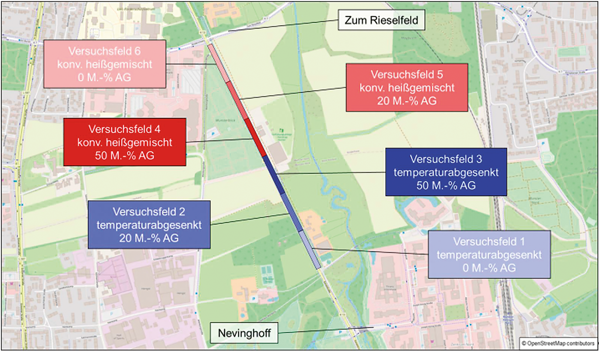 Die Versuchsstrecke unterteilt sich in sechs Versuchsfelder, bei denen der Anteil von Asphaltgranulat sowie die Temperaturabsenkung variiert, siehe Abb. 7. Das ursprünglich angestrebte Ziel, das beim Ausbau der Asphaltdeckschicht anfallende Material als Asphaltgranulat wiederzuverwenden, scheiterte an materialtechnischen Problemen (u. a. haftkritisches Gestein). Stattdessen kam sortenreines Granulat aus offenporigem Asphalt zum Einsatz.