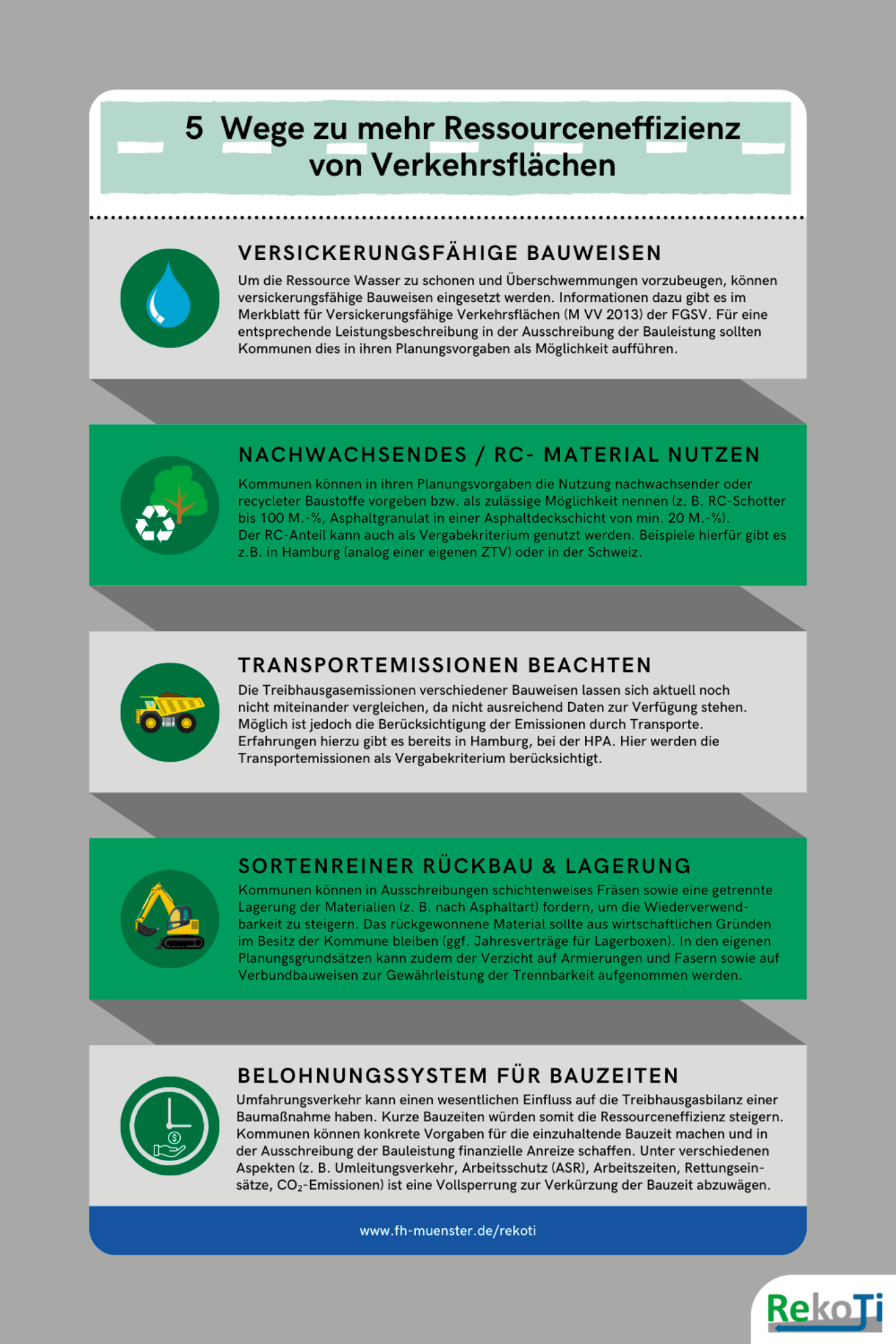 Im Projekt RekoTi wurden die Ressourceneffizienzpotenziale des kommunalen Tiefbaus untersucht. Ein zentrales Ergebnis ist die Erfassung des anthropogenen Materiallagers für Verkehrswege, Brücken und Kanalisation. Zudem wurden Verfahren zum Bau und Management dieser Infrastrukturen simuliert, analysiert und in Form einer Versuchsstrecke umgesetzt. Das Projekt liefert somit theoretische und praktische Erkenntnisse zur Steigerung der Ressourceneffizienz. Alle Ergebnisse wurden in einem digitalen Leitfaden dokumentiert, der als Wiki umgesetzt wurde. Dieses bietet sowohl einen grundlegenden Überblick über das Projekt als auch vertiefende Informationen zu einzelnen Verfahren. Die wichtigsten Erkenntnisse wurden in fünf Handlungsempfehlungen (Verkehrsflächen, Brücken, Kanalisation, Stoffstrommanagement, Informationsmanagement) zusammengefasst. Sie liefern praxisnahe Empfehlungen und ermöglichen einen schnellen Einstieg in Handlungsoptionen zur Steigerung der Ressourceneffizienz im Tiefbau. Abb. 9 zeigt beispielhaft die erarbeitete Handlungsempfehlung für Verkehrsflächen. Alle Handlungsempfehlungen sind im RekoTi-Wiki abrufbar. Einen zusammenfassenden Einblick in die Fragestellungen des Projektes RekoTi gibt das im Projekt erstellte Video5.