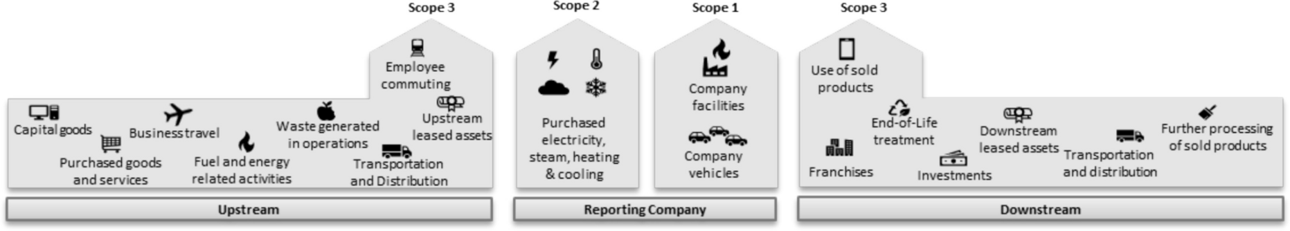 The classification of these emissions follows the internationally recognized GHG Protocol standard, which serves as the basis for corporate climate accounting. Figure 1 illustrates the segmentation of emissions across upstream, operational, and downstream activities, aligned with the system boundaries defined in the GHG protocol.
