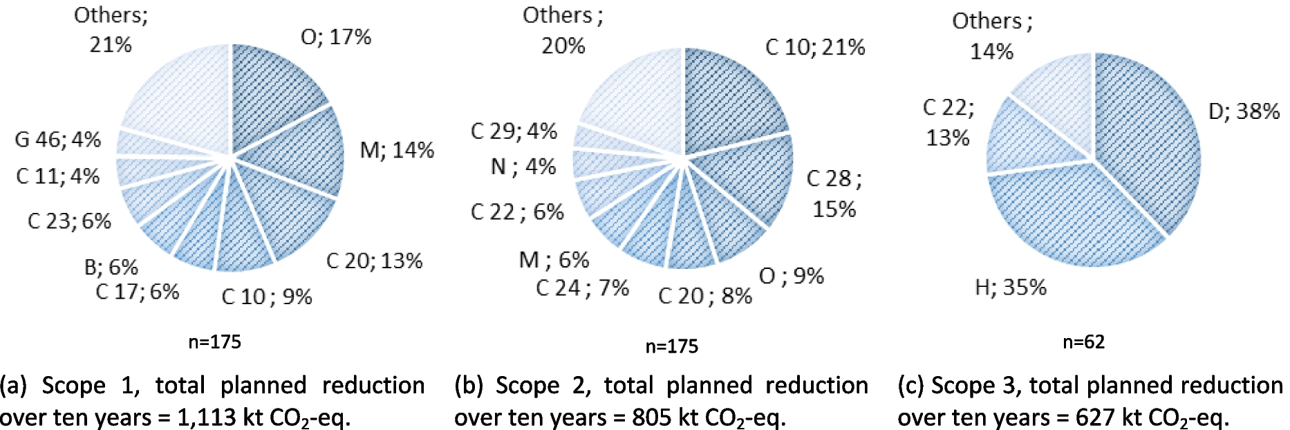 Sectoral share of planned GHG emission reductions by scope over the next ten years in %: a Scope 1, b Scope 2, c Scope 3. Sector codes refer to the NACE Rev. 2 classification. A full mapping of sector names to NACE codes is provided in Appendix 1. Own visualization based on unpublished evaluation data compiled by the authors