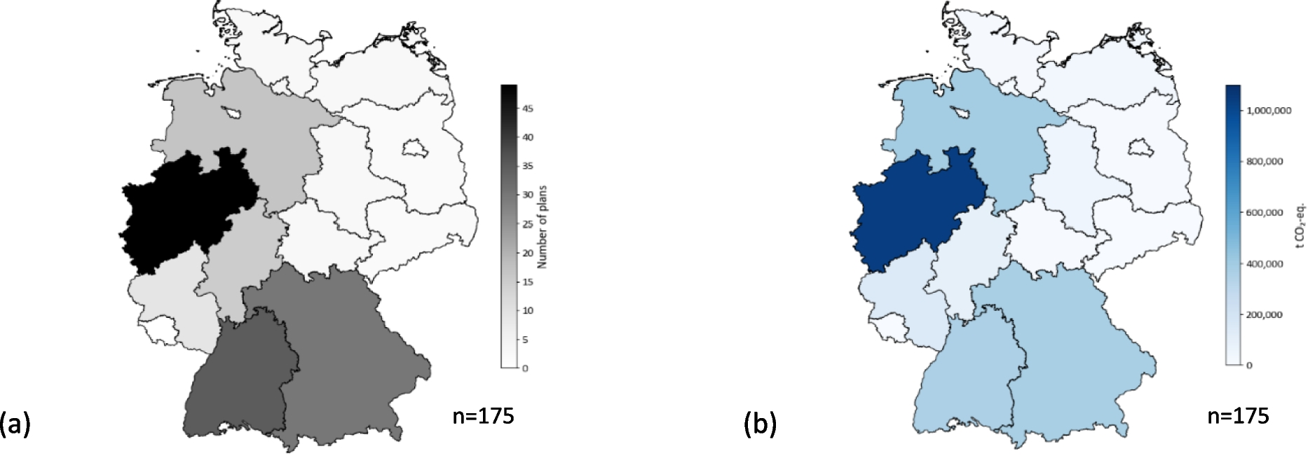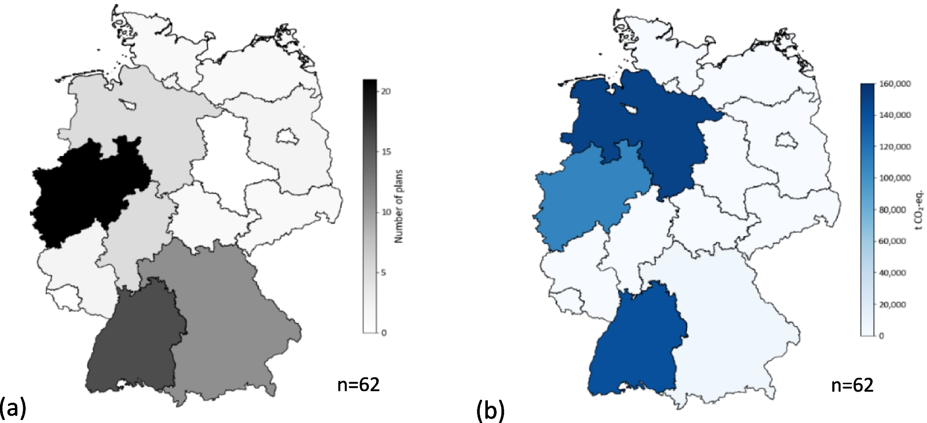 These regional differences are visualized in Fig. 4. Panel (a) shows the number of transformation plans submitted per federal state, while panel (b) illustrates the corresponding cumulative emission reduction targets over the next ten years.