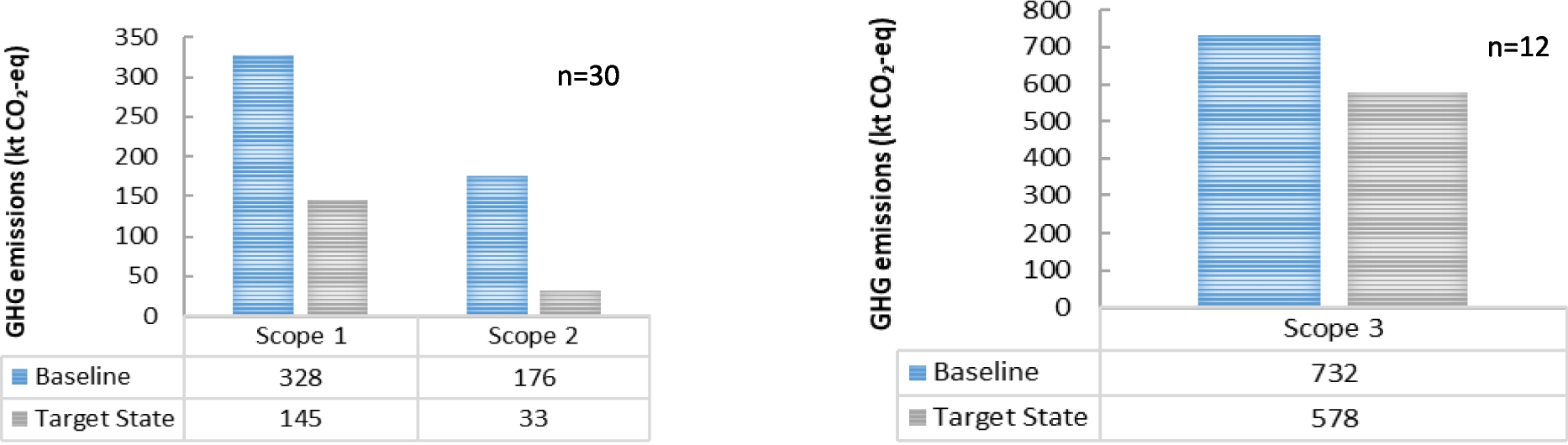 Scope-specific averages reveal substantial differences: Scope 1 emissions were reduced by 55%, Scope 2 by 81%, and Scope 3 by only 21%. Figure 6 summarizes the baseline and target emissions for this subsample across all three scopes.