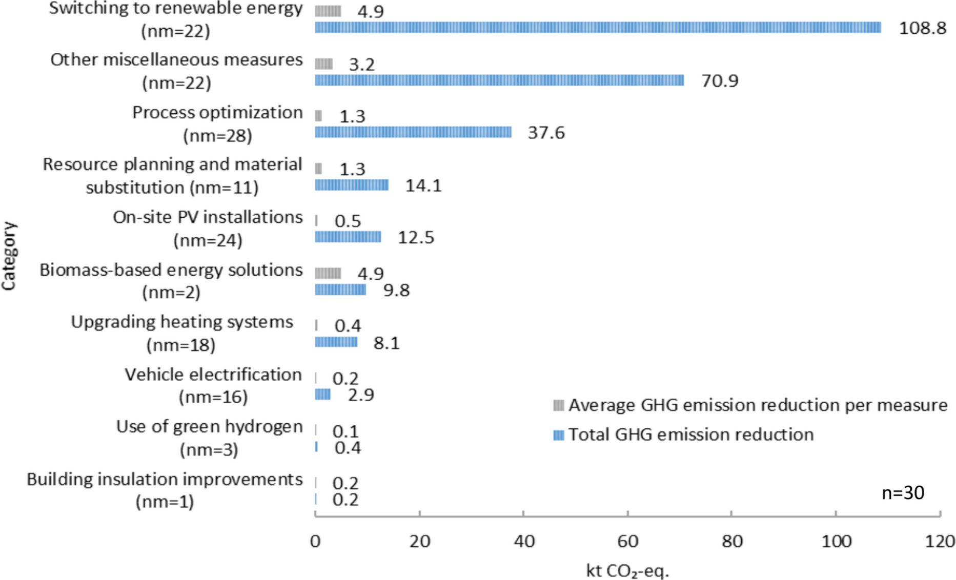 Across the 30 transformation plans, a total of 147 distinct measures (nm) were identified. The largest absolute GHG emission reduction was achieved through switching to renewable energy sources (108.8 kt CO2-eq.), while the most commonly proposed category was process optimization (nm = 28).
