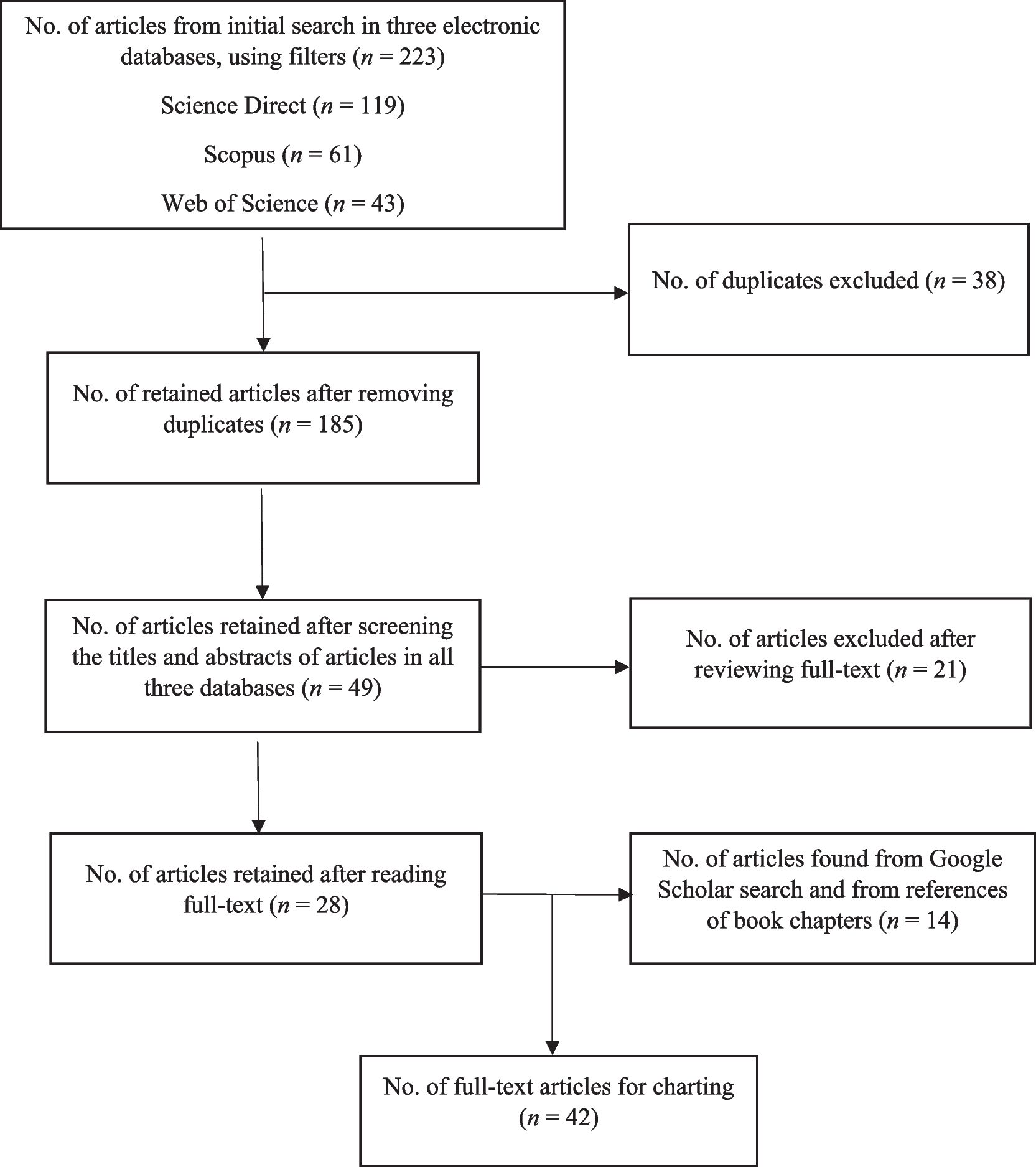 To gather more relevant articles, Google Scholar and the references of book chapters and some of the retained articles were searched. Fourteen additional articles were found from this process, bringing the total number of articles to be included in the analysis to 42.