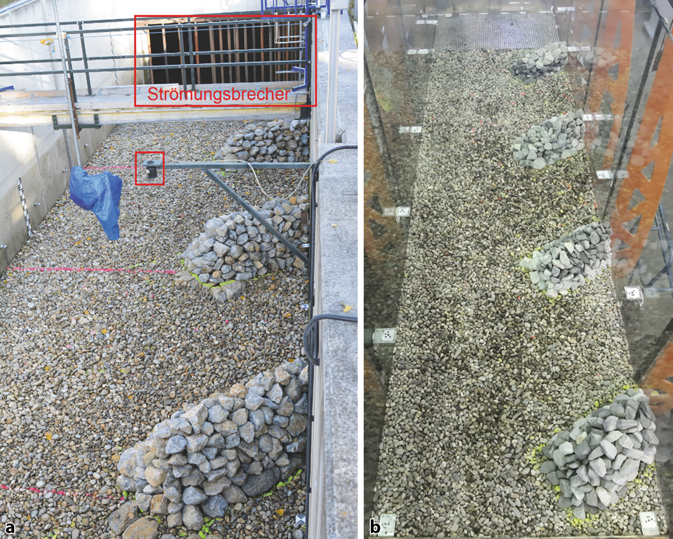 Eine Besonderheit des Forschungsgerinnes ist, dass es zwei Kurven im Grundriss aufweist, bevor das Gerinne in den offenen Versuchsabschnitt mündet. Am Beginn des offenen Versuchsabschnitts sind deshalb sogenannte Strömungsbrecher angeordnet. Dabei handelt es sich um zwei Reihen aus versetzten vertikalen Stahlrohren, deren Stababstände variiert werden können. Im Außenbogen, d. h. auf der linken Gerinneseite, sind die Stäbe enger gesetzt, da hier höhere Geschwindigkeiten auftreten. Im Innenbogen sind die Stäbe lockerer gesetzt. In Abb. 1a sind die Strömungsbrecher ersichtlich. Referenzmessungen haben gezeigt, dass mit den Strömungsbrechern die asymmetrische Geschwindigkeitsverteilung stark reduziert, jedoch noch nicht vollkommen eliminiert wird.