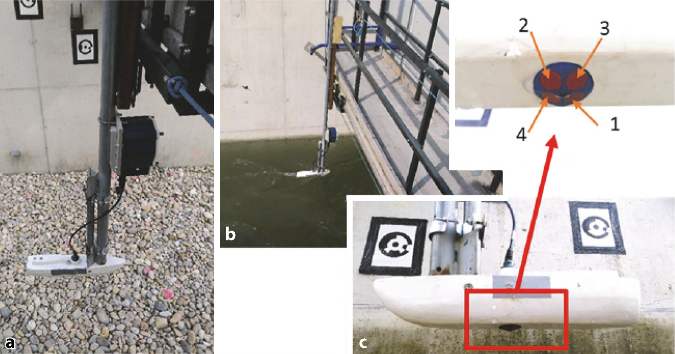 Blick auf die ADCP-Messvorrichtung: a,b stromlinienförmiges Mini-Messboot auf der Messbrücke, c bündiger Einbau des Sensorkopfs mit den 4 Wandlern am Rumpf des Messboots