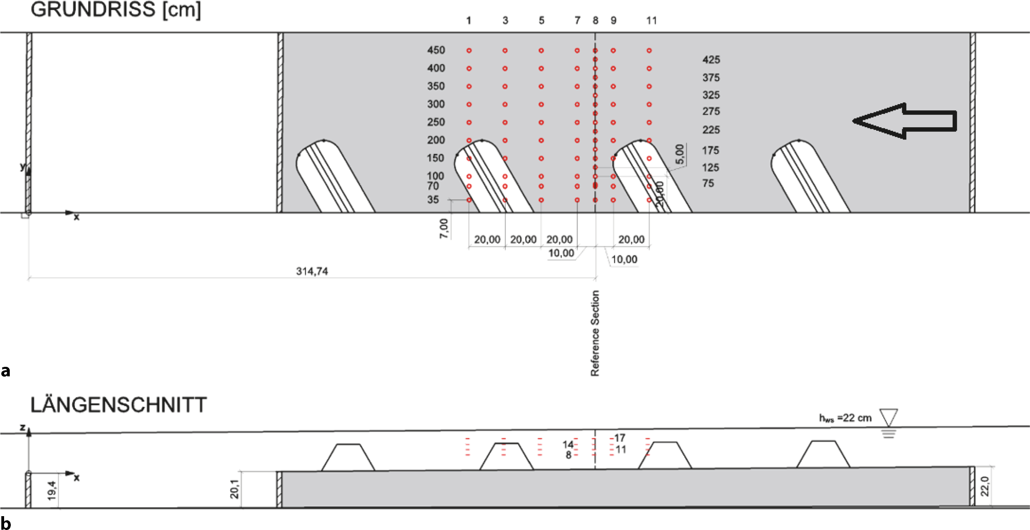 Die 1:1-Versuchsserie der deklinanten Buhnen wurde im Forschungsgerinne des BOKU-Wasserbaulabors durchgeführt. In dem 5 m breiten Rechteckgerinne aus Stahlbeton wurde eine 19 m lange Versuchsplattform mit einer Kiessohle im Gefälle S = 0,007 aufgebaut. Die Kiessohle hatte als charakteristische Korndurchmesser d10 = 15,2 mm, d50 = 24,4 mm und d90 = 34,0 mm. Linksufrig wurden vier deklinante Buhnen angeordnet, die ein Drittel der Gerinnebreite einnahmen und einen Abstand von 4,4 m hatten, was in etwa zweimal der Buhnenlänge entspricht (Abb. 1a). Die Buhnen hatten einen Inklinationswinkel von 60 Grad (Buhnenrücken zu flussab gelegener Ufermauer). Die Buhnen wurden aus Kantkorn der Größen von 15 bis 30 cm hergestellt und etwa 20 cm in die Sohle eingebunden. Rund um den Buhnenkopf wurde mit demselben Material die Sohle vor Auskolkungen gesichert. Der Querschnitt der Buhnen war trapezförmig, der Buhnenrücken horizontal.