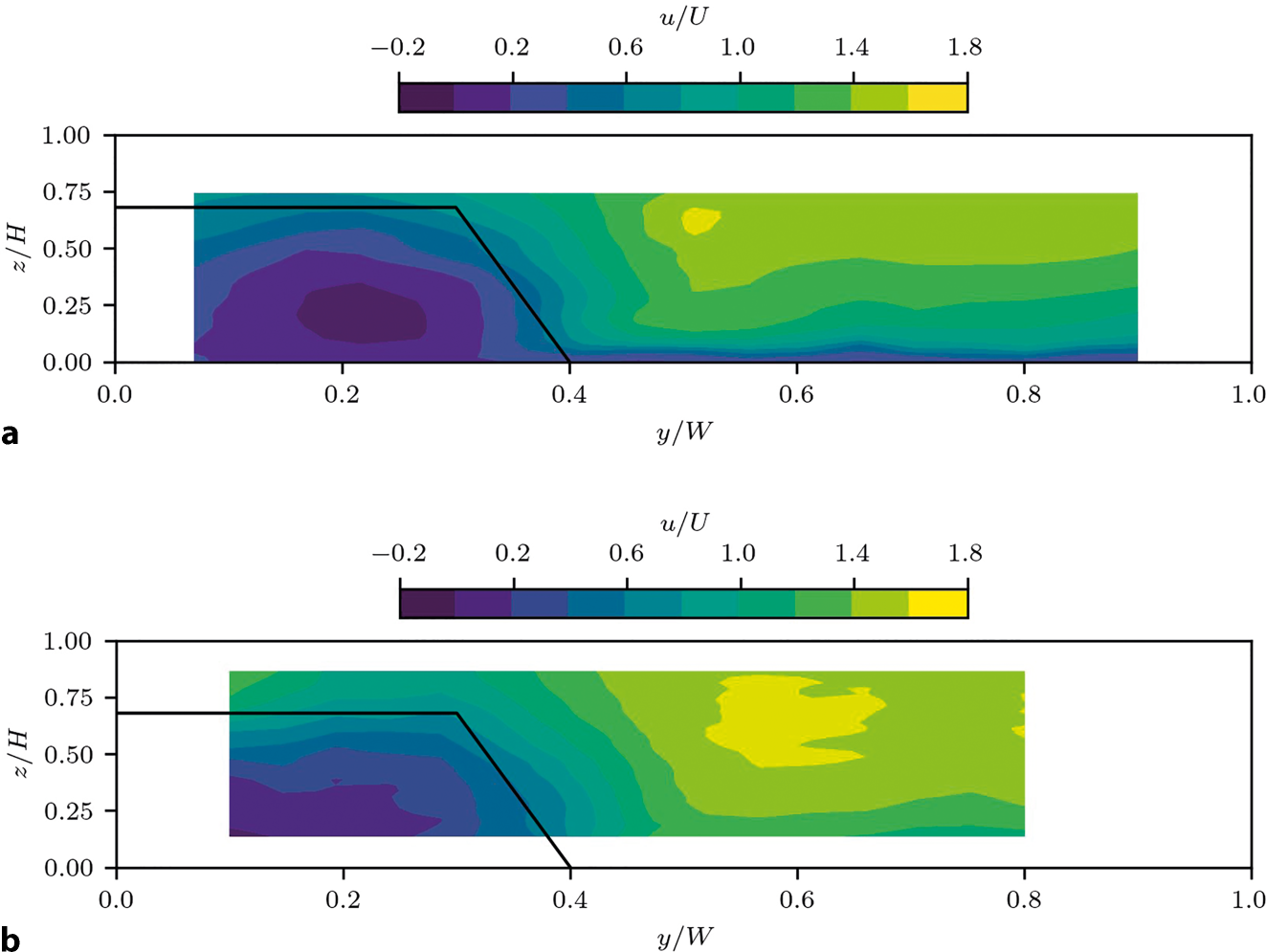 In Abb. 4 sind die normierten, zeitlich gemittelten Fließgeschwindigkeiten u/U im Referenzprofil in den Maßstäben 1:5 und 1:1 dargestellt. Die laterale Stationierung y ist mit der Gerinnebreite W normiert, die vertikale Stationierung z mit der Wassertiefe H. Die Geschwindigkeitsmessungen der 1:5-Versuche reichen deutlich näher an die Sohle und den rechten Gerinnerand als die 1:1-Versuche, dafür liegen letztere bis nahe an den Wasserspiegel vor.