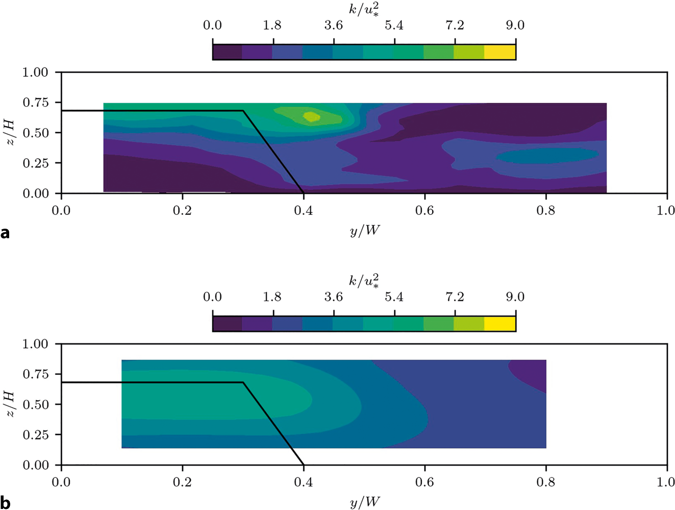 In Abb. 5 ist die normierte turbulente kinetische Energie für die Maßstäbe 1:5 (a) und 1:1 (b) dargestellt. Die laterale Stationierung y ist mit der Gerinnebreite W normiert, die vertikale Stationierung z mit der Wassertiefe H. Hier zeigen sich in den Maßstäben qualitative Unterschiede. Beim 1:1-Versuch ist TKE im Hauptstrom deutlich niedriger als im Buhnenfeld. Beim 1:5-Versuch ist TKE im Hauptstrom ebenfalls niedrig. Dies gilt jedoch auch für das Buhnenfeld für z/H < 0,5. Dies ist ein qualitativer Unterschied zum 1:1-Versuch, wo über die gesamte Höhe des Buhnenfelds TKE gegenüber dem Hauptstrom deutlich erhöht ist.