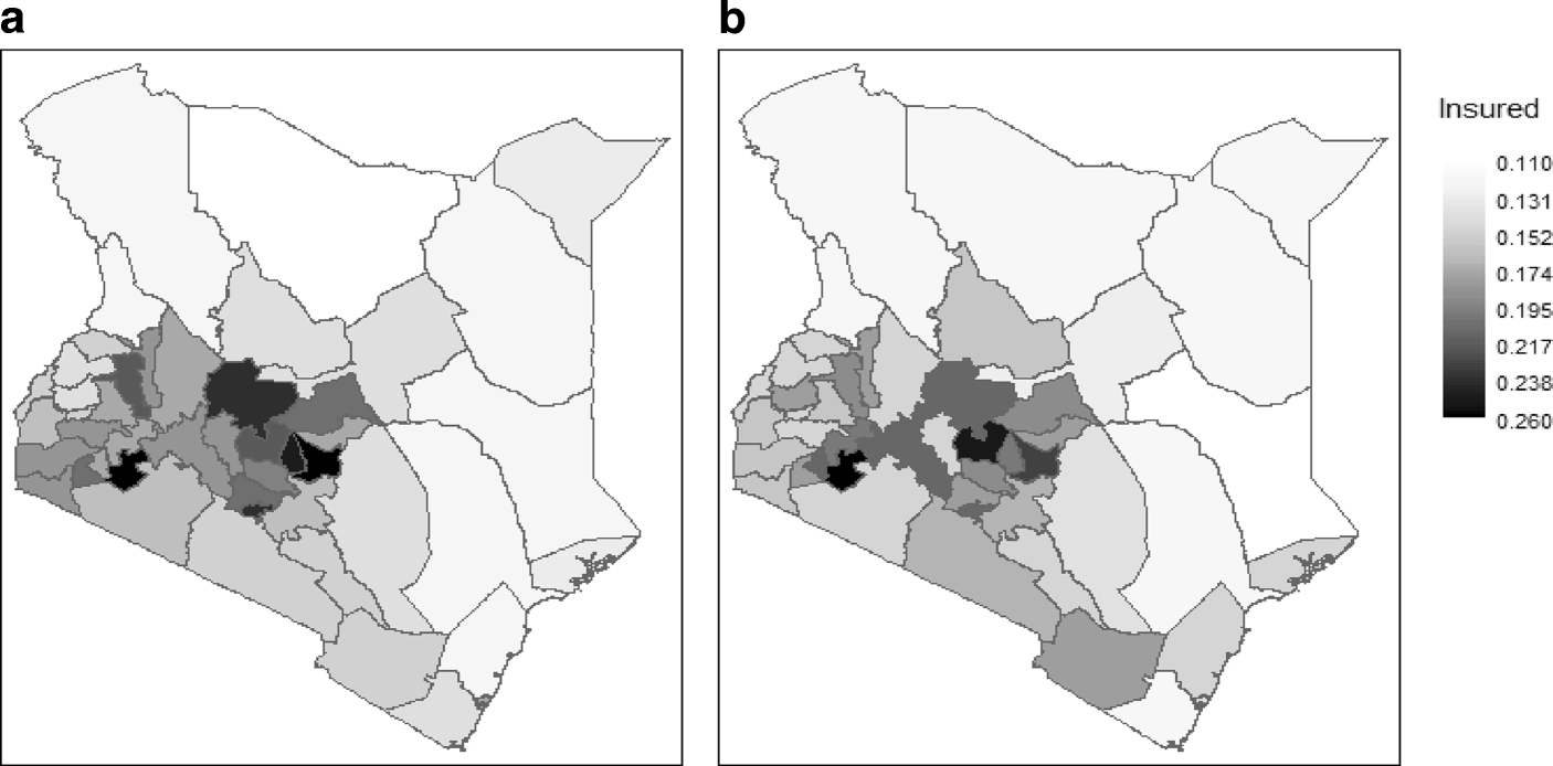 Fig. 3 shows smooth maps of health insurance coverage for the 47 counties in Kenya using M‑quantile estimation. The observed distribution is similar for women and men. Counties with highest coverage for women are Bomet \((24\%)\), Embu \((23.6\%)\), Kirinyaga \((22.8\%)\) and Nairobi \((22\%)\). The five least covered counties are West Pokot \((10.9\%)\), Turkana \((10.8\%)\), Garissa \((10.7\%)\) and Marsabit \((10.3\%)\). For men the leading counties are; Nairobi \((27.2\%)\), Bomet \((24.8\%)\), Nyeri \((23.4\%)\), Nyamira \((22.2\%)\) while the least covered counties are; Mandera \((11\%)\), Tana River \((10.6\%)\), Garissa \((10.6\%)\) and Kwale \((10.4\%)\). From the findings, we note that counties neighboring Nairobi have higher coverage rates. Since these counties are close to Nairobi which is the capital city of Kenya, with more employment opportunities, people living here are able to afford health insurance premiums. This is in contrast to counties further away like Turkana and Garissa. These results have been possible with the use of SAE methodology.