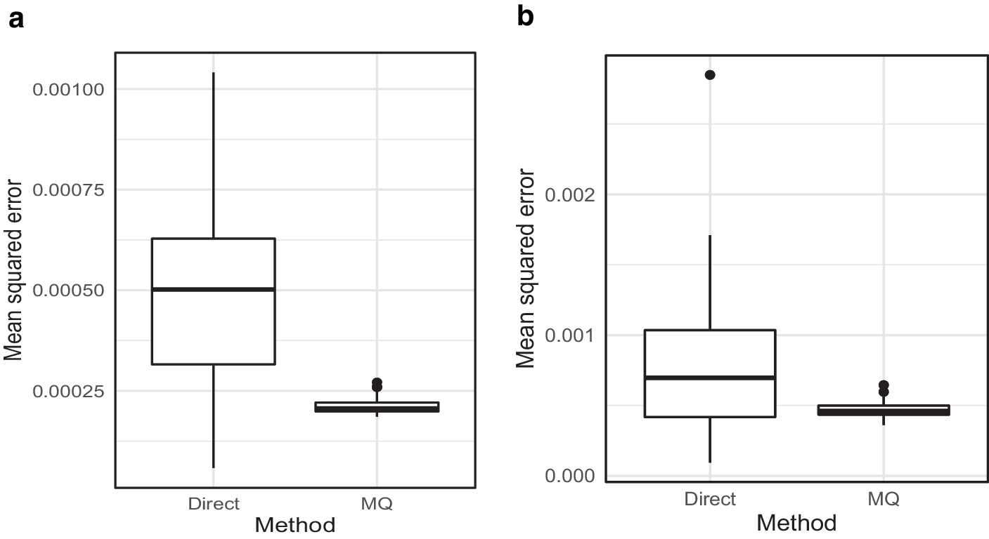 For MSE, Fig. 4a and b are the box plots of estimated MSEs of the estimated health insurance coverage for women and men. The MSE for both women and men are smaller for MQ compared to direct estimates. For CV’s, Table 9 shows quantiles of the coefficient of variation for the estimated health insurance percentages at county level in Kenya. For direct estimates especially for counties with small samples, the CV’s reach values greater than \(60\%\) for both women and men. For MQ estimates all the CV’s were less than 20. Since Kenya has not set a guideline for publishing official statistics, we use other statistical offices like the UK’s Office for National Statistics (ONS). They set a CV of \(20\%\) for publishable official statistics. Therefore, our estimates meet this cut-off.