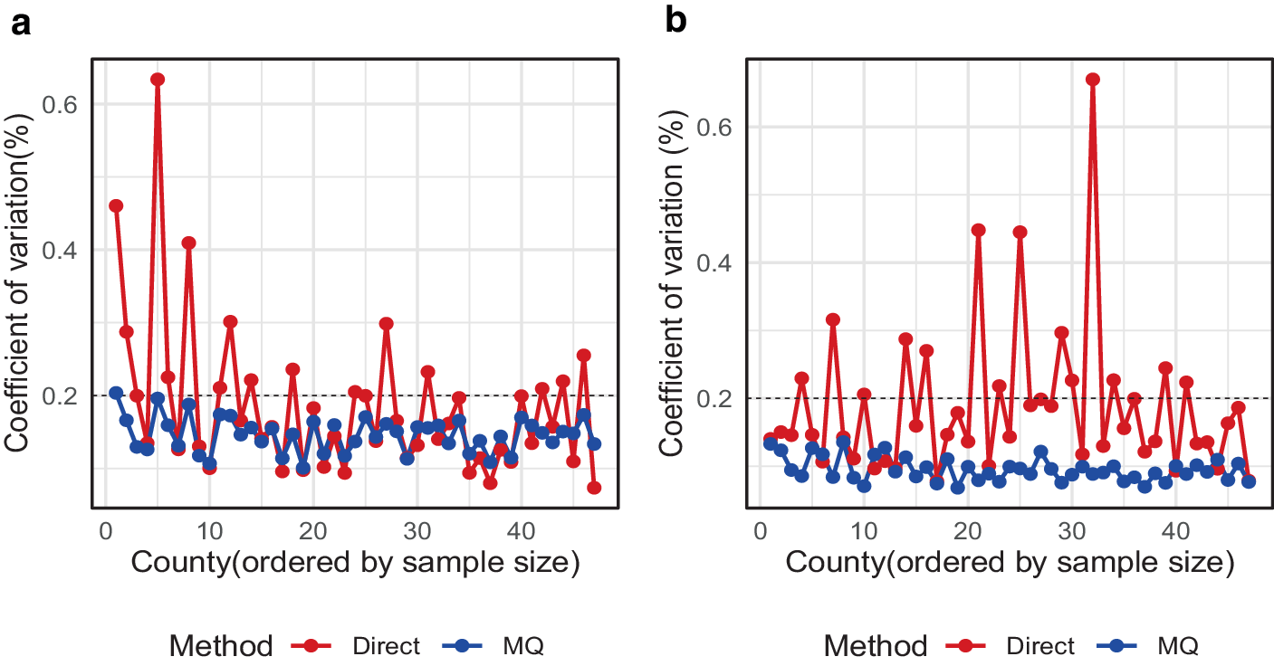Fig. 5 are line graphs with counties ordered by increasing sample sizes. To start with as expected the CV’s for MQ estimates are smaller than direct estimates for all counties. As the sample sizes per county increase, the CV’s for direct estimates reduce, especially for the women sample. By contrast, however, the CVs for direct estimates do not reduce with increasing sample size for men. For this analysis, the samples ranged from 236 to 460 for women and from 118 to 370 for men.