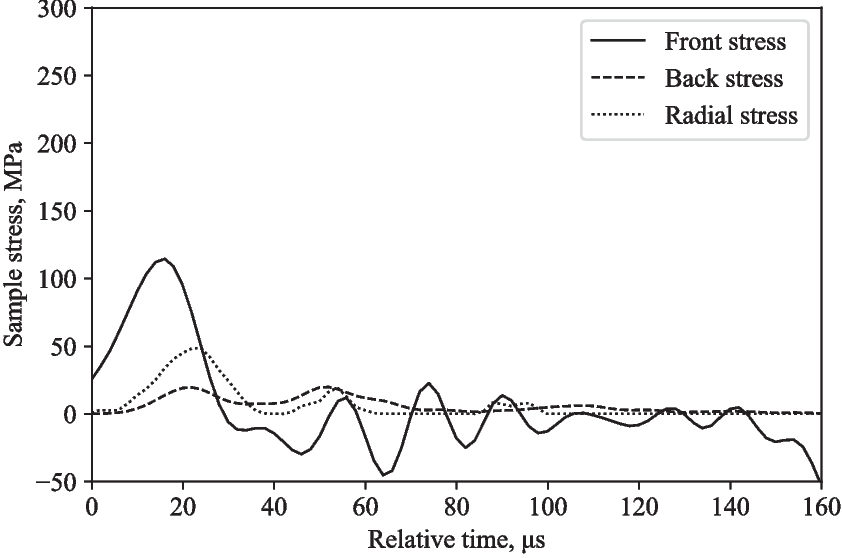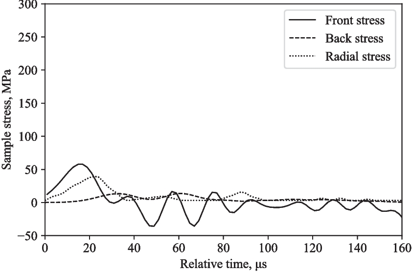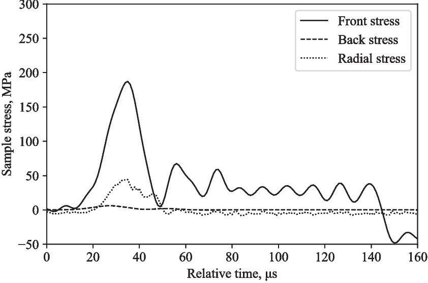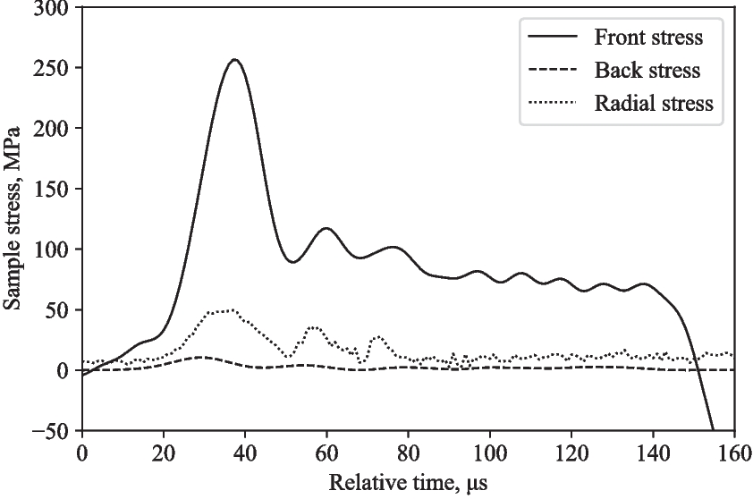 Figures 12 and 14 depict the experimentally measured front, back and radial stresses. The radial stress directly adjacent to the water in between the pressure bars was calculated by taking into account the transit time of the radial stress wave through the water annulus (5.1 \(\mu \)s, assuming a wave speed in water of 1482 m/s). The recorded radial stress shows a radial stress wave with peaks that align relatively well with front and back stresses, indicating that the lateral response recorded with the pressure transducer is a direct result of the axial loading from the SHPB test.