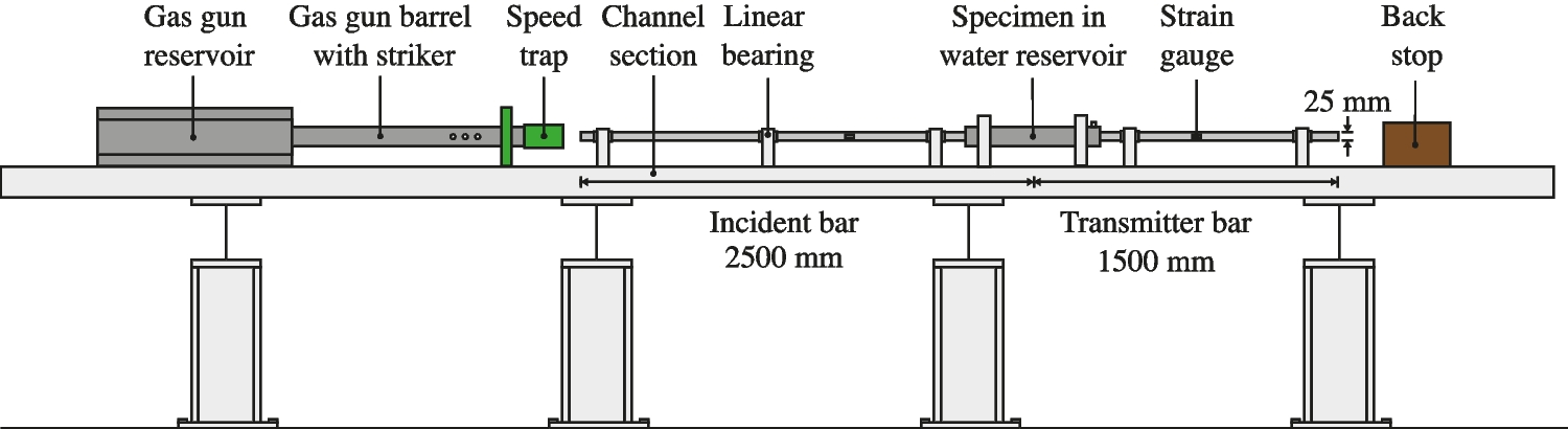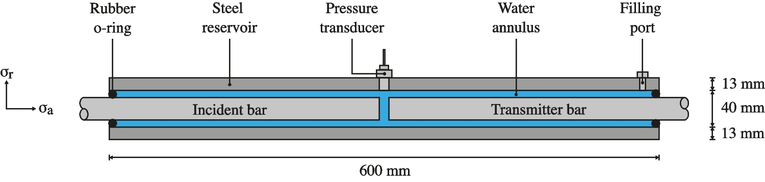 The modified SHPB is made up of a standard pressure bar arrangement which consists of a striker, an incident and a transmitter bar, 25 mm in diameter, with a 350 mm, 2500 mm and 1500 mm length, respectively, as shown in Fig. 1. In addition, as illustrated in Fig. 2, a 600 mm long steel water reservoir is set on linear bearings and centred around the specimen. When the pressure bars are in place, the annular gap present throughout the length of the reservoir is filled with water at atmospheric pressure, as depicted in Fig. 2.