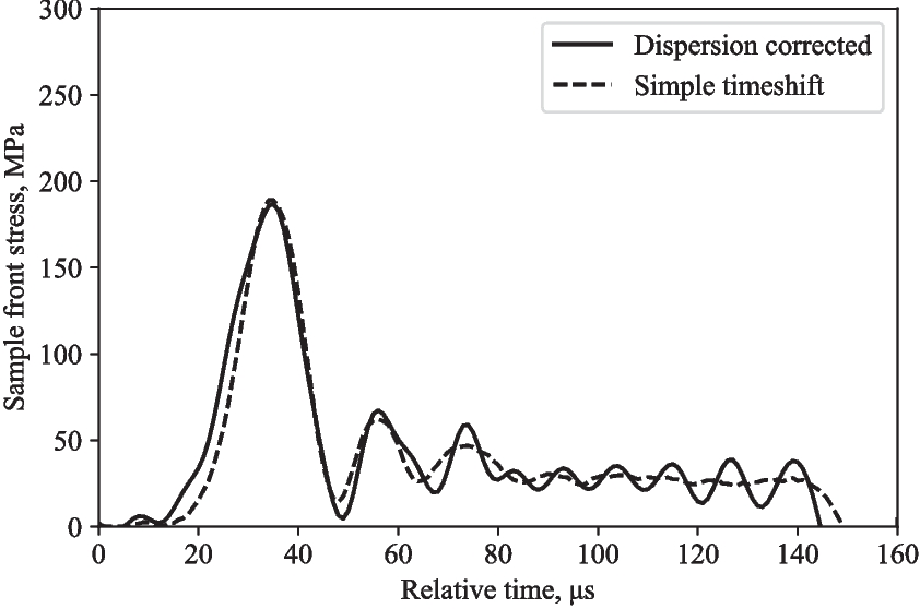 Figure 6 shows how the dispersion-corrected approach minimises the amplitude of the stress wave and eliminates an initial fluctuation in stress, which would have led to incorrect inferences about the specimen’s behaviour. In this case, dispersion effects are minimal.